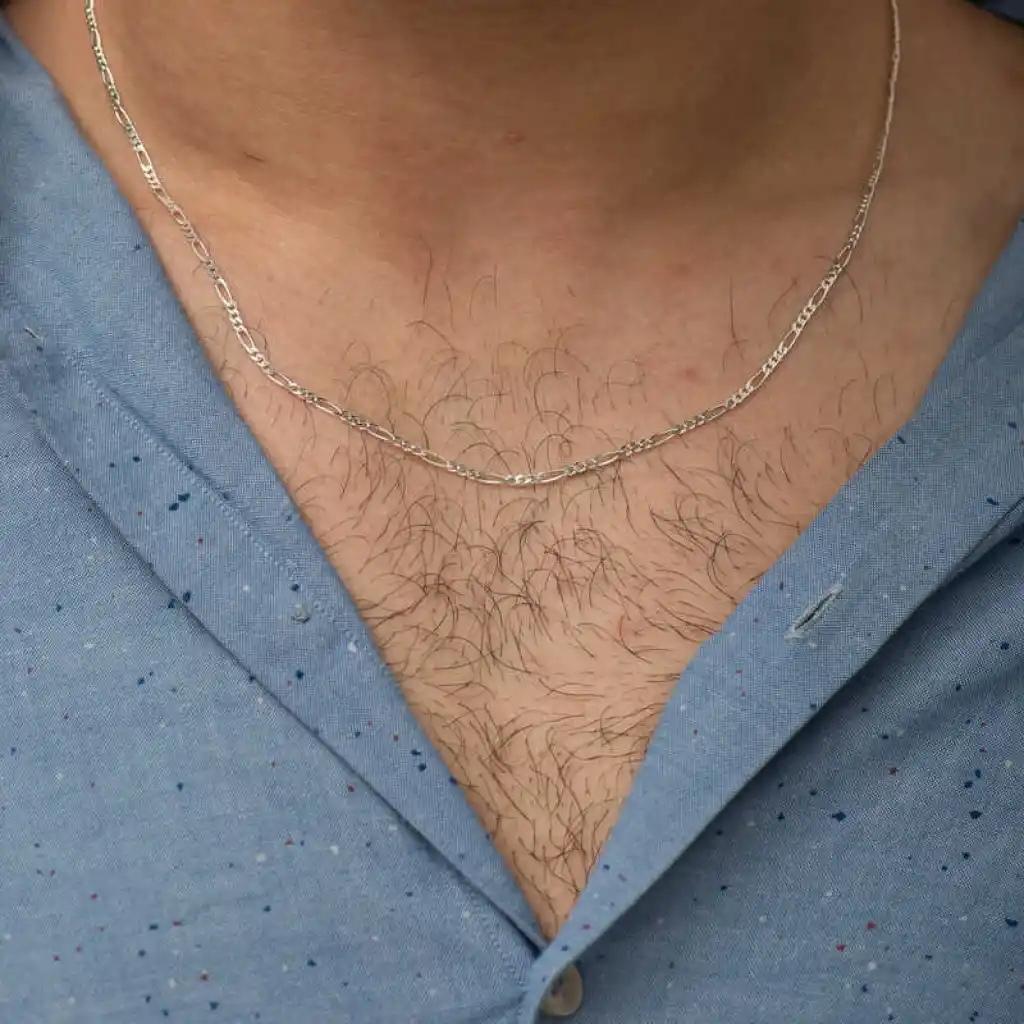 Gümüş zincir modelleri, gümüş takılar içerisinde hiç kuşkusuz en çok tercih edilen ürün gruplarından birisidir. Hem boyunları, hem de bilekleri süsler. İster kolye uçları ile birlikte, isterseniz de sade zincir şeklinde kullanabilirsiniz. Bu klasik figaro zincir modeli 925 ayar gümüşten imal edilmiştir. Makinelerde metre şeklinde üretilip daha sonra el emeği ile kolye haline getirilmektedir. Gümüş üzerine parlaklığı uzun süre koruması için ayrıca gümüş kaplama da yapılmıştır. Gümüş figaro zincir modellerini hem erkekler hem kadınlar rahatlıkla kullanabilir. Tüm gümüş zincir modellerinde olduğu gibi 925 ayar gümüş figaro zincir modeli de el emeği ile üretildiği için belirtilen ortalama ürün ağırlığında ± %10 oynama olabilir.