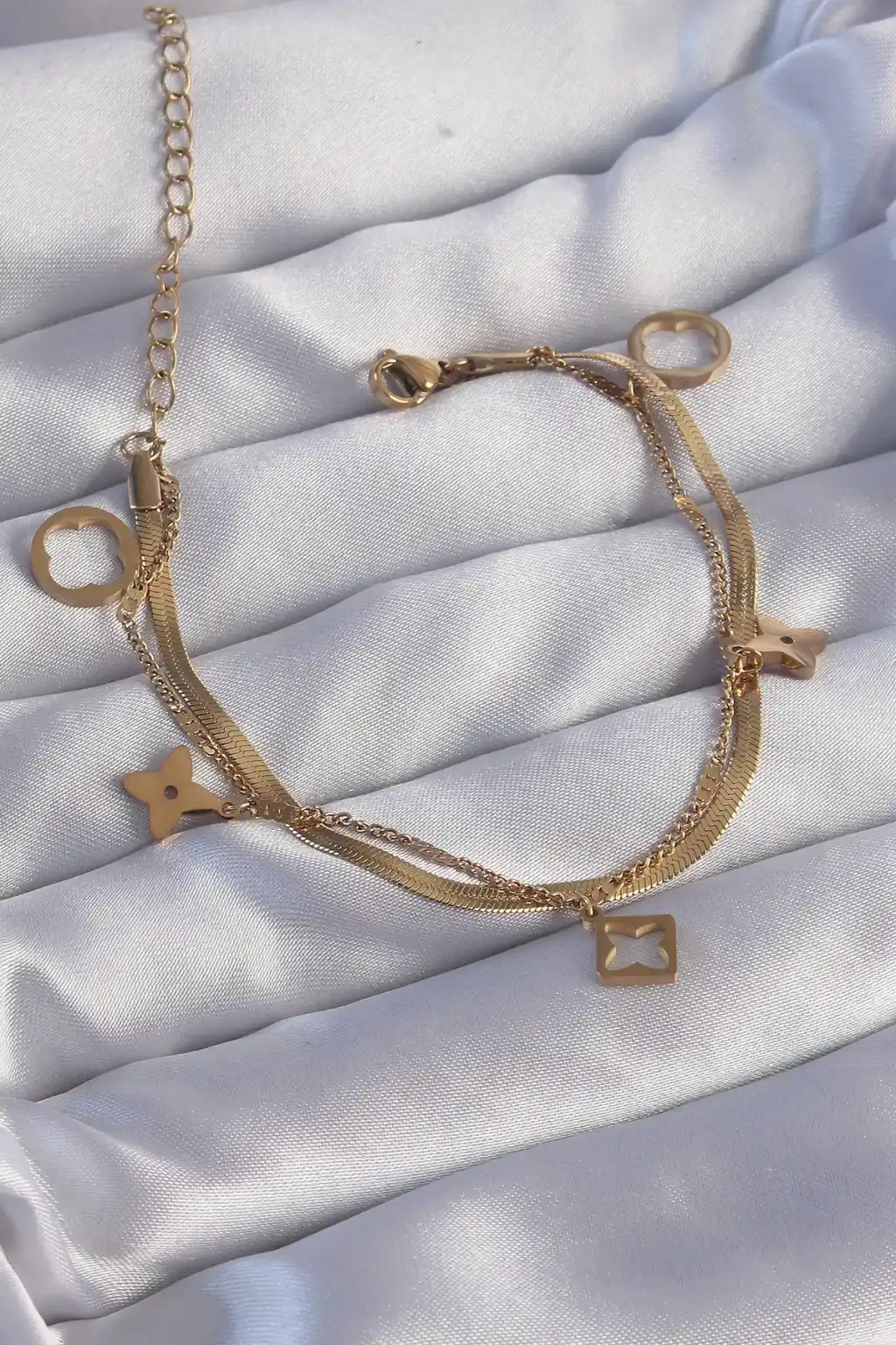 316L Çelik Gold Renk Çift Zincir Yonca Tasarım Bileklik