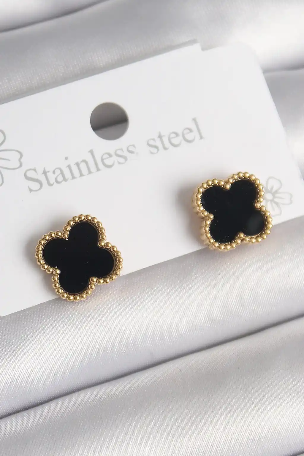 316L Çelik Gold Renk Siyah Yonca Model Kadın Küpe