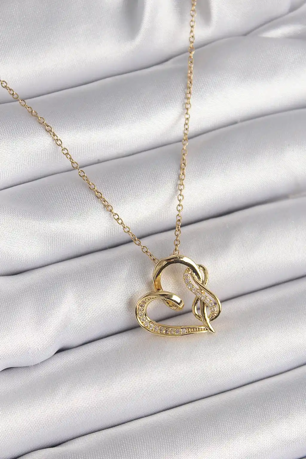 316L Çelik Gold Renk Zincir Zirkon Taş Detaylı Kalp Model Sonsuzluk Detay Kadın Kolye