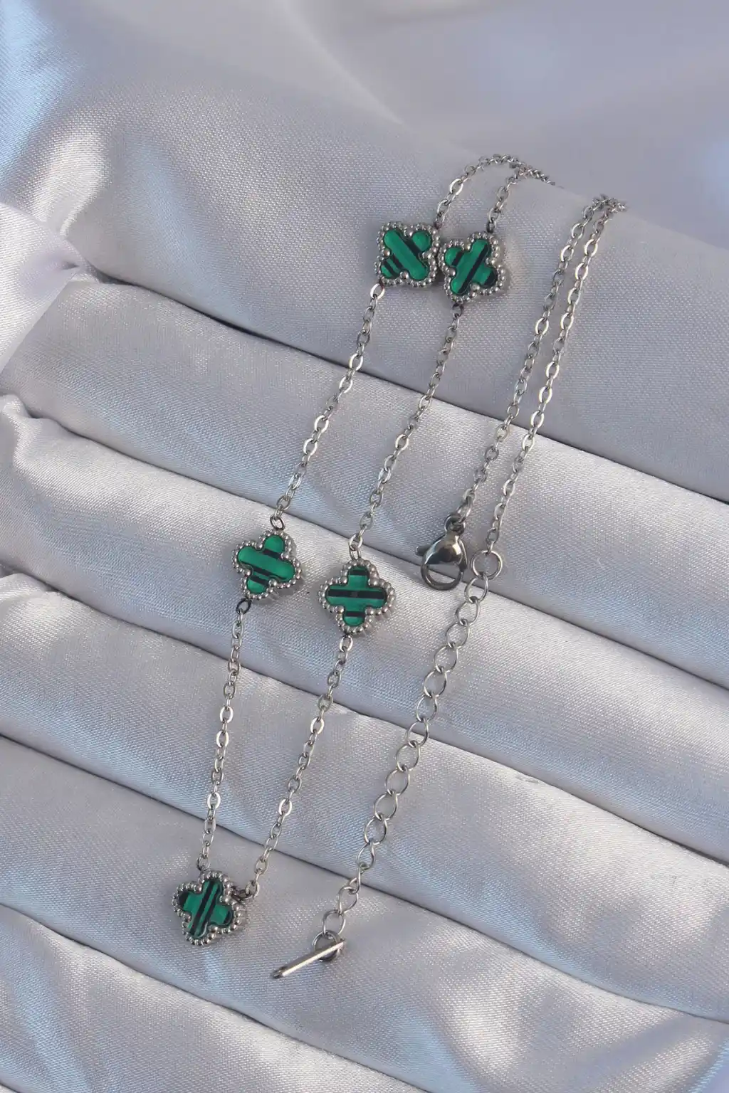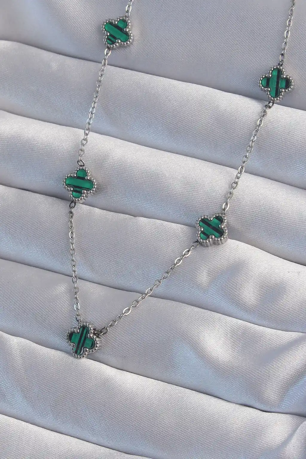 316L Çelik Gümüş Renk Minimal Yeşil Mineli Yonca Kolye