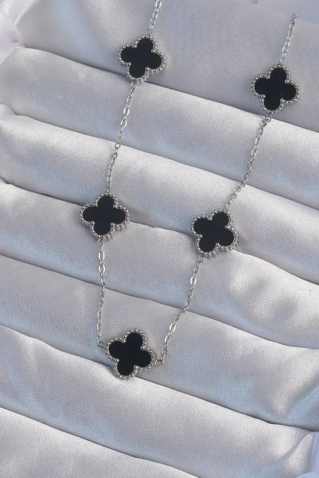 316L Çelik Gümüş Renk Siyah Mineli Yonca Kolye