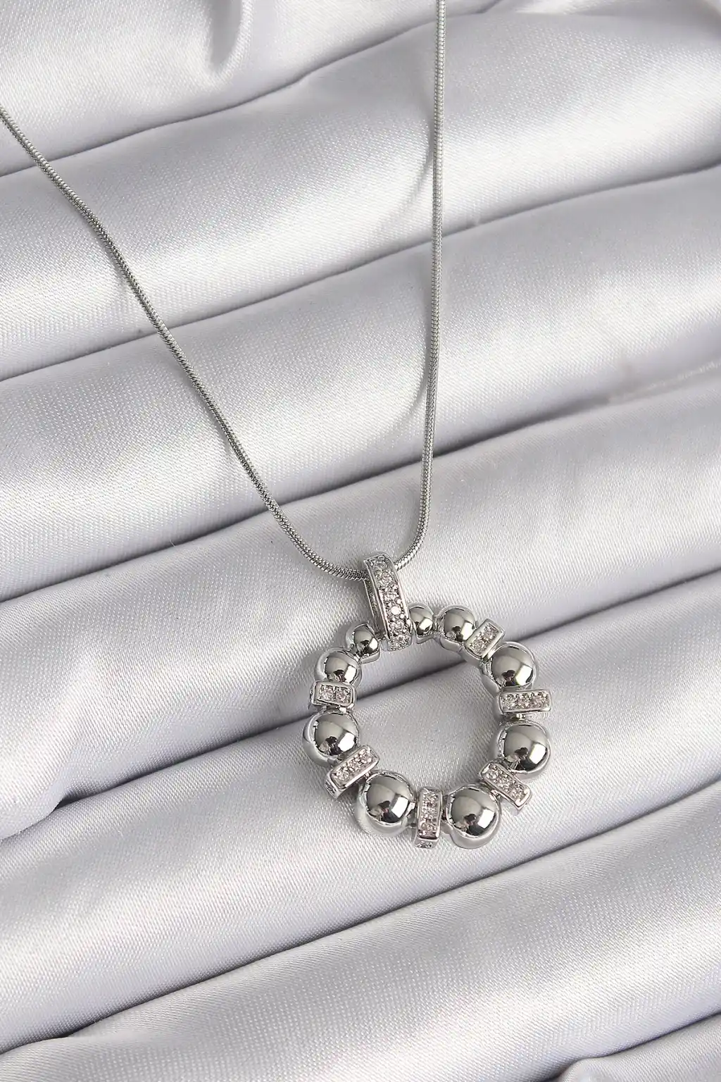 316L Çelik Gümüş Renk Zincir Zirkon Taş Detaylı Bombeli Halka Model Kadın Kolye