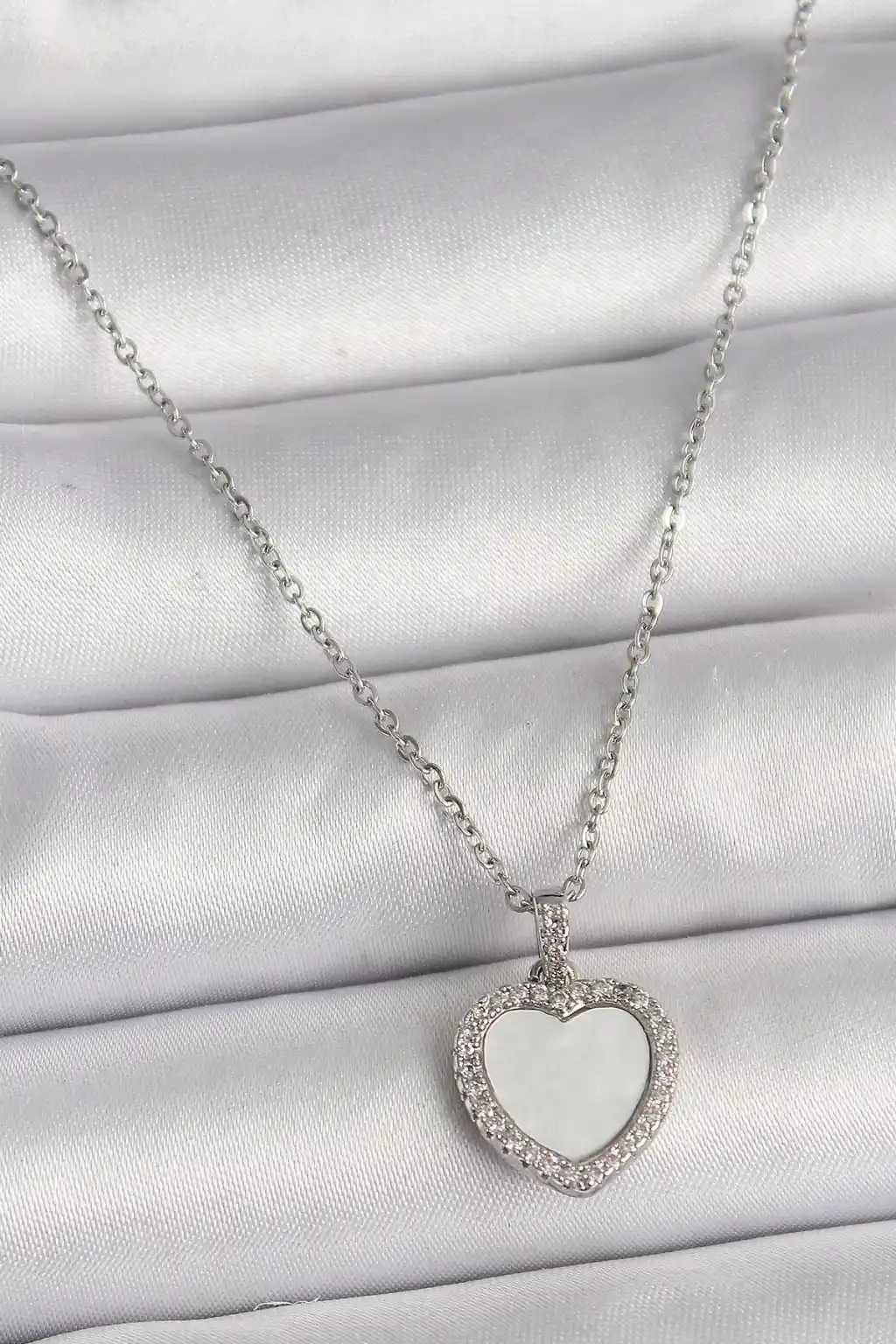 316L Çelik Gümüş Renk Zincir Zirkon Taşlı Beyaz Mineli Kalp Model Kadın Kolye
