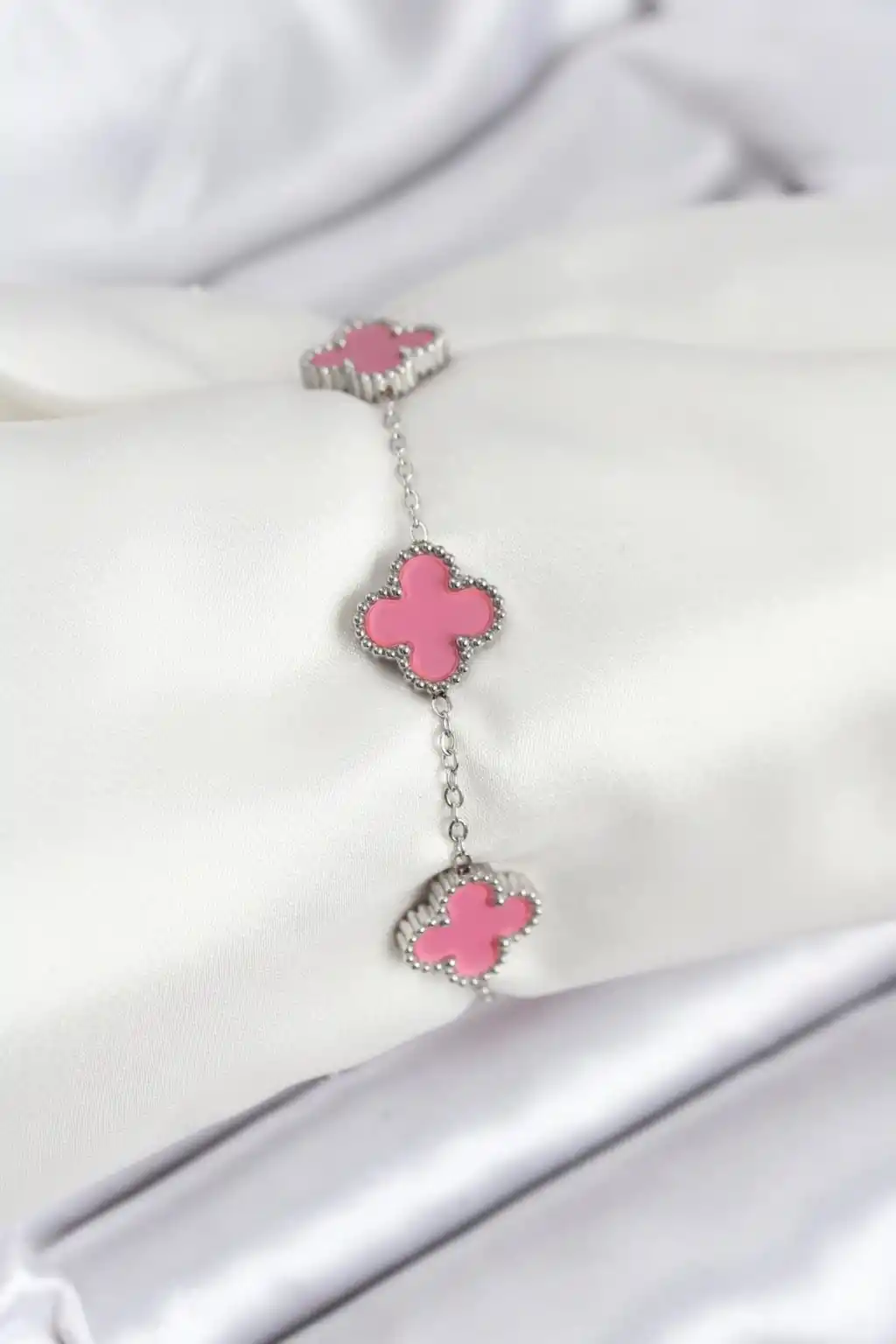 316L Çelik Gümüş Zincir Pembe Renk Yonca Bileklik
