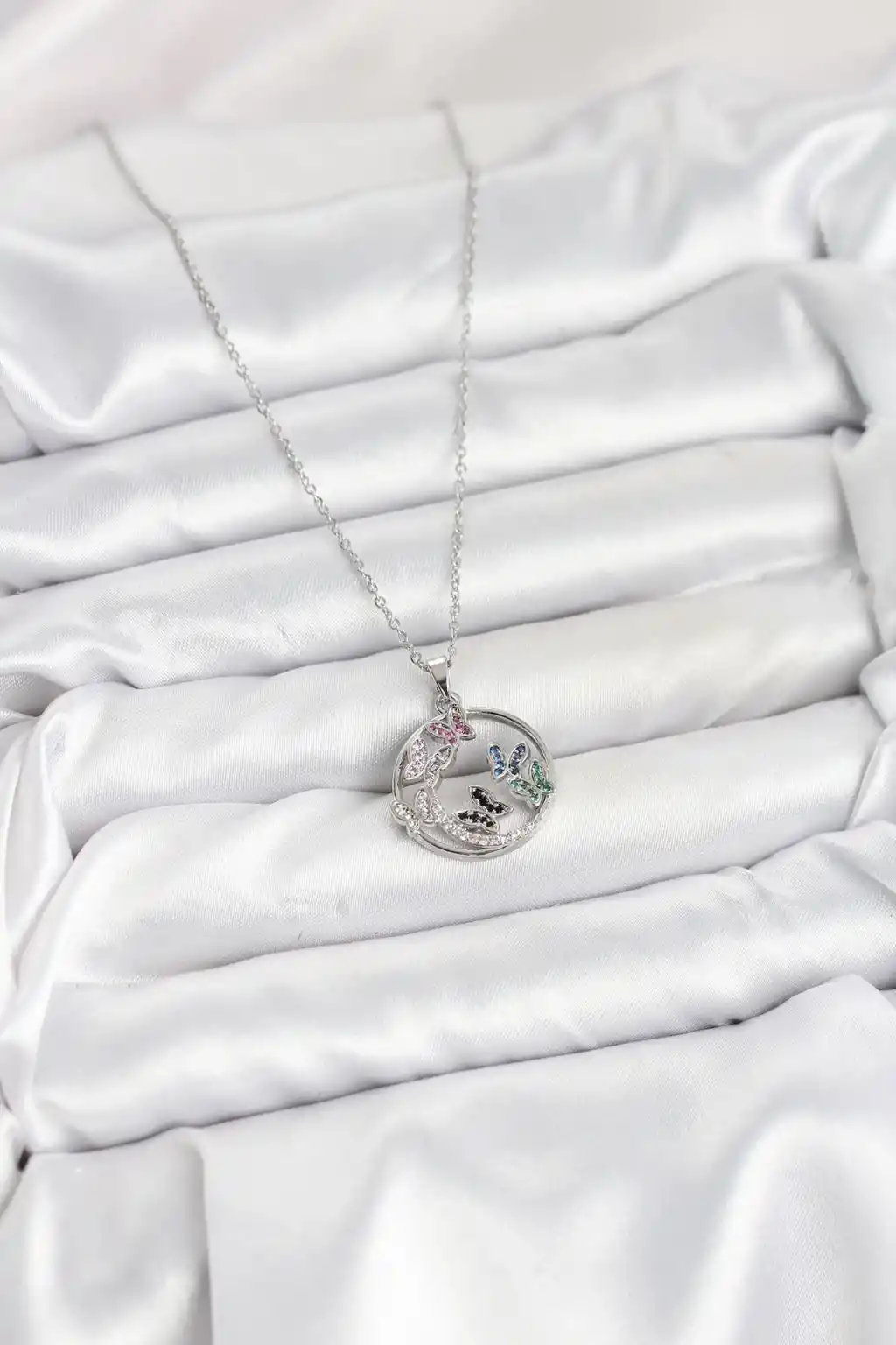 316L Çelik Zincir Gümüş Renk Zirkon Taşlı Kelebekli Kadın Kolye