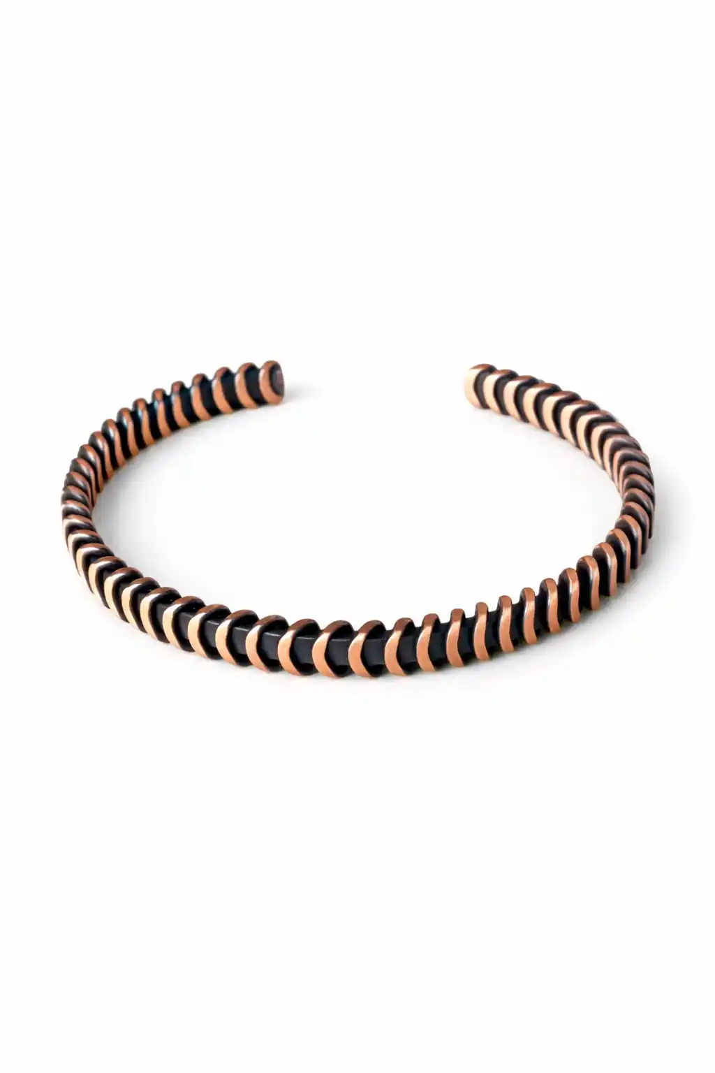 El yapımı bakır kelepçe bileklik, spiral desenli özgün tasarımıyla dikkat çeker.