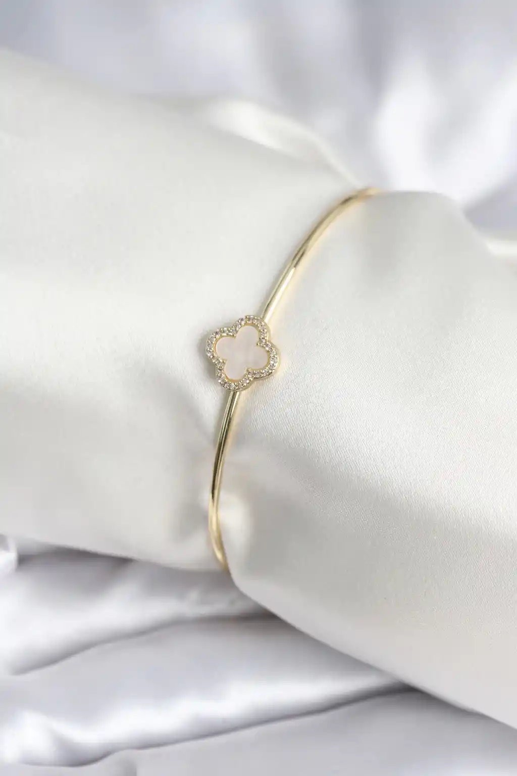 Beyaz Sedefli Yonca Model Gold Renk Kadın Bileklik