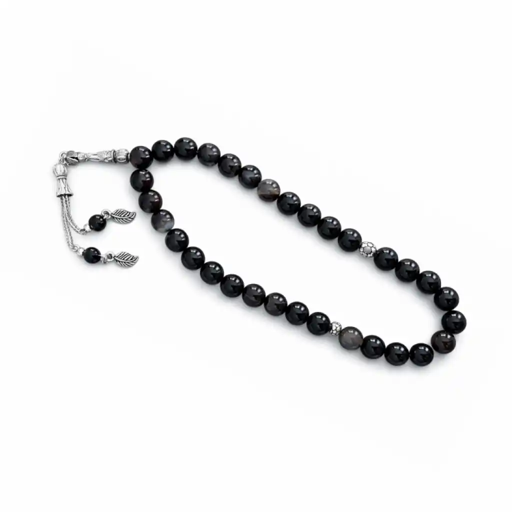 Bu özel tespih, siyah akik taşının derin enerjisini ve geleneksel el işçiliğini bir araya getirir. Her biri özenle seçilmiş 10 mm küre kesim taşlar, parlak yüzeyleriyle ışığı doğal biçimde yansıtır