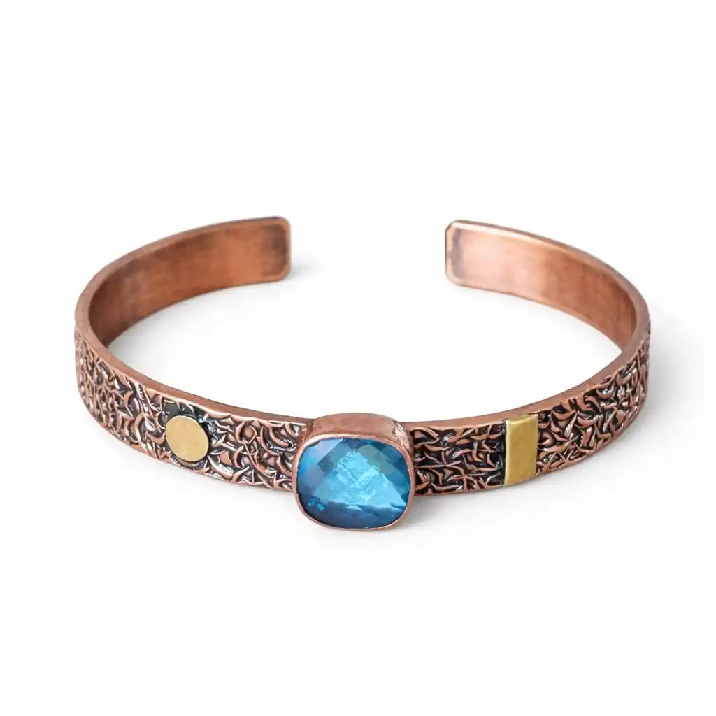 El işçiliğiyle üretilmiş bu bakır kelepçe bileklik, doğal dokusu ve taş detayıyla zamansız bir stil sunar.