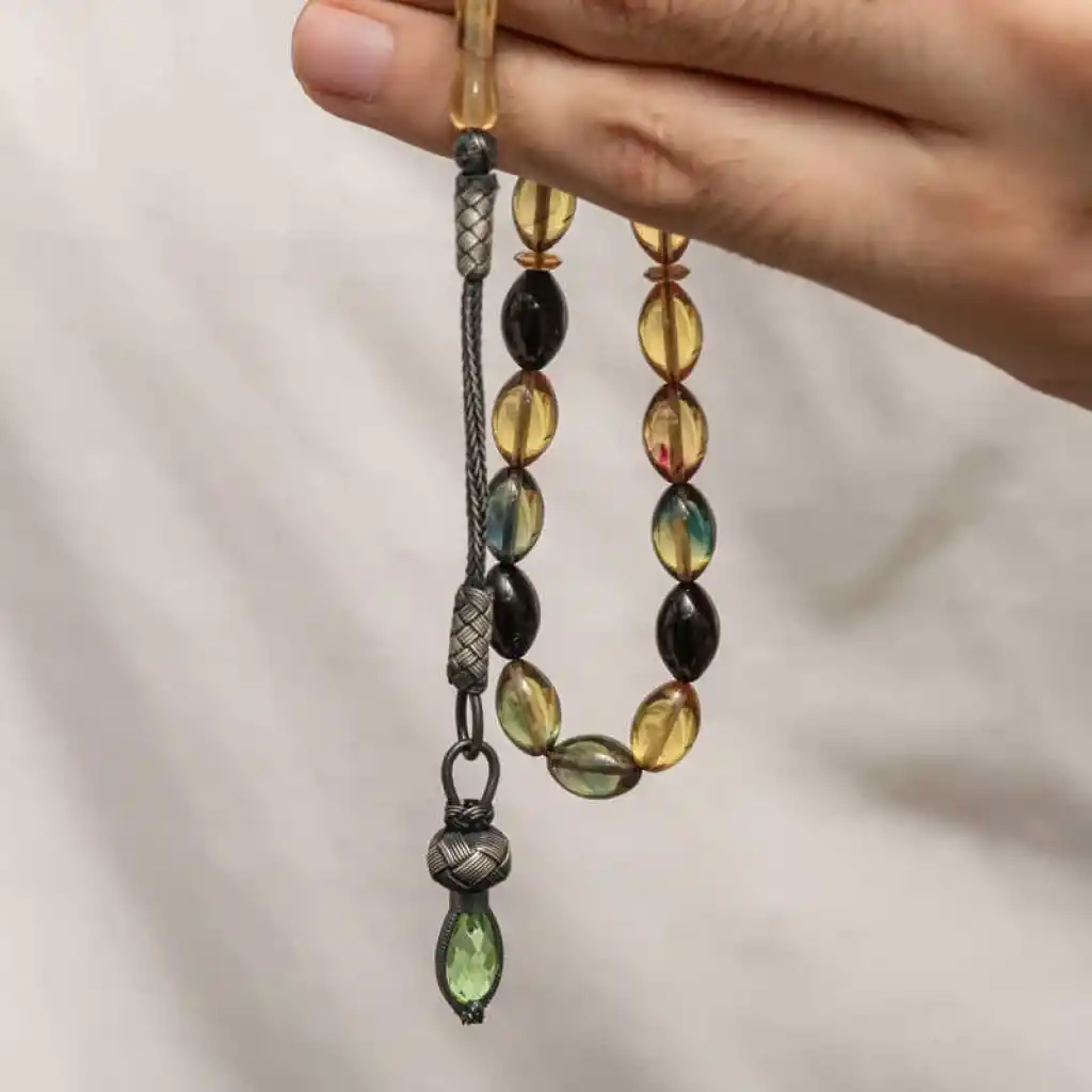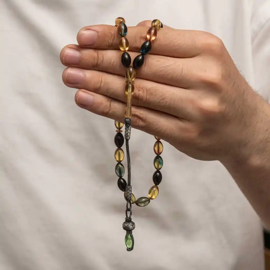 Kehribar, çam ağacı reçinesinin toprak altında uzun yıllar boyunca birikerek oluşan bir maddedir. Hemen hemen taş ile aynı sertliktedir fakat yoğunluğu düşüktür. Çam kokusu yayar. Oluşumu uzun zaman aldığından ve yapay olarak yapılamadığından değerli bir maddedir. Sıkma kehribar ise kehribar taşından farklı olarak onun özelliklerini taşıyan, görüntü itibariyle ona benzeyen fakat gerçek olmayan bir malzemedir. Ülkemizde ve dünyanın bir çok yerinde kehribar taşından çeşitli malzemeler üretilmiştir. Ülkemizde en yaygın olarak tesbih üretilmektedir. Kehribar tesbihler elde ısındıkça kehribar benzeri bir koku verir ve renk değiştirir. Bir çok rengi vardır. Hatta iki rengin birleşiminden oluşan kehribar tesbih modelleri de vardır. Genellikle gümüş püskül ile kullanılır veya sistemli olarak da kullanılabilir. Ülkemizin güzide tesbih ustaları bu malzemeyi sıklıkla işlemek suretiyle çeşitli sanat eserleri meydana getirirler. Bu tesbihler de koleksiyonerler tarafından alınıp satılmaktadır. Gümüş 1000 ayar kazaz püsküllü sıkma kehribar tesbih modeli de günlük hayatta kullanılabilecek çok şık bir tesbih çeşididir. Özel günlerin vazgeçilmez hediyesi sıkma kehribar tesbihler erkekler için doğum günü, sevgililer günü ve babalar günü gibi özel zamanlarda hediye olarak tercih edilebilir. Gümüş kazaz püsküllü sıkma kehribar tesbih modeli diğer kehribar tesbih modellerinde olduğu gibi tamamen el emeği ile imal edilmiştir.