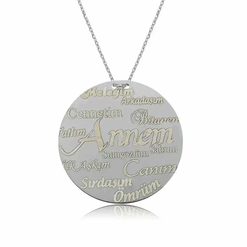 Gümüşün ışıltısı ve kelimelerin anlamı yaşam enerjinizi etrafınıza yansıtacak. Hayatta en değerli varlığımız olan annelerimize onu özel hissettirecek bir hediye vermek isteyenler için gümüş annem yazılı bayan kolye çok uygun olacaktır. Bu annelere özel annem yazılı bayan kolye 925 ayar gümüşten imal edilmiştir. Gümüş üzerine rodyum kaplama yapılmıştır. Rodyum kaplama yapılan gümüş bayan kolye modelleri parlaklığını uzun süre muhafaza eder ve oksitlenmesi gecikir. Zincir uzunluğu ortalama 45 cm"dir. Gümüş annem yazılı bayan kolye diğer tüm gümüş bayan kolye modellerinde olduğu gibi el emeği ile üretilmiştir. Gümüş ve değerli taşlar nedeniyle belirtilen ürün ağırlığında ± %10 sapma olabilmektedir.