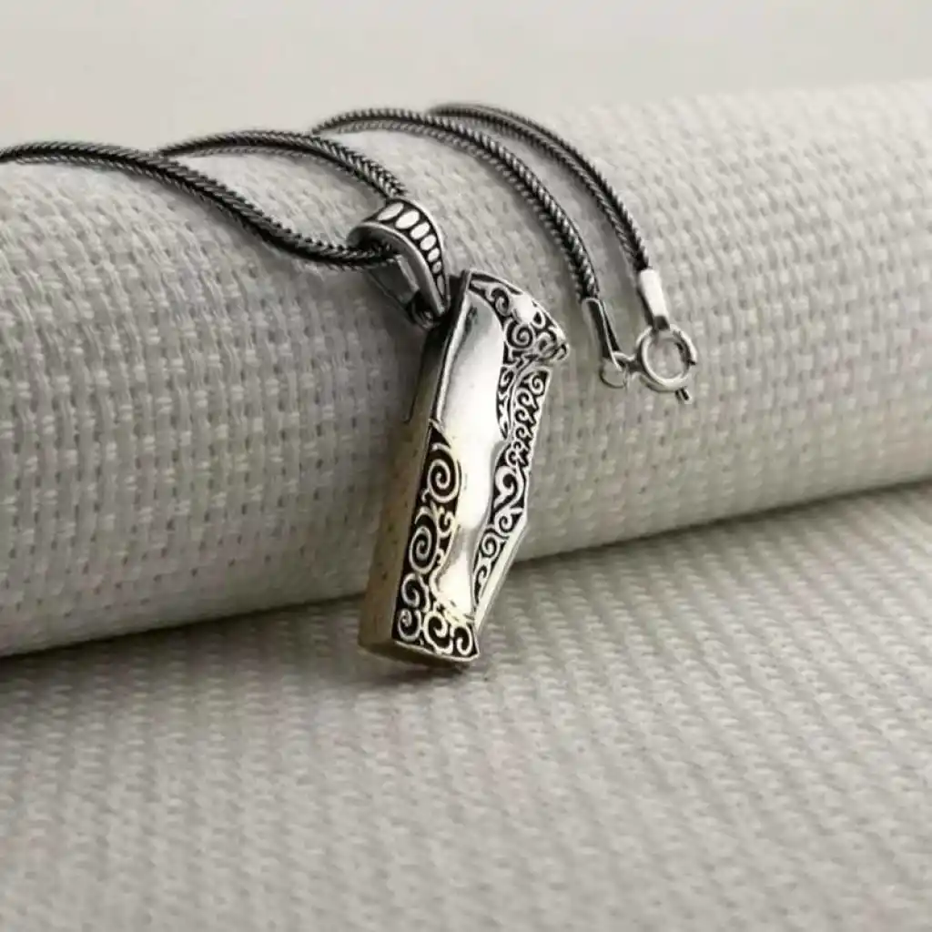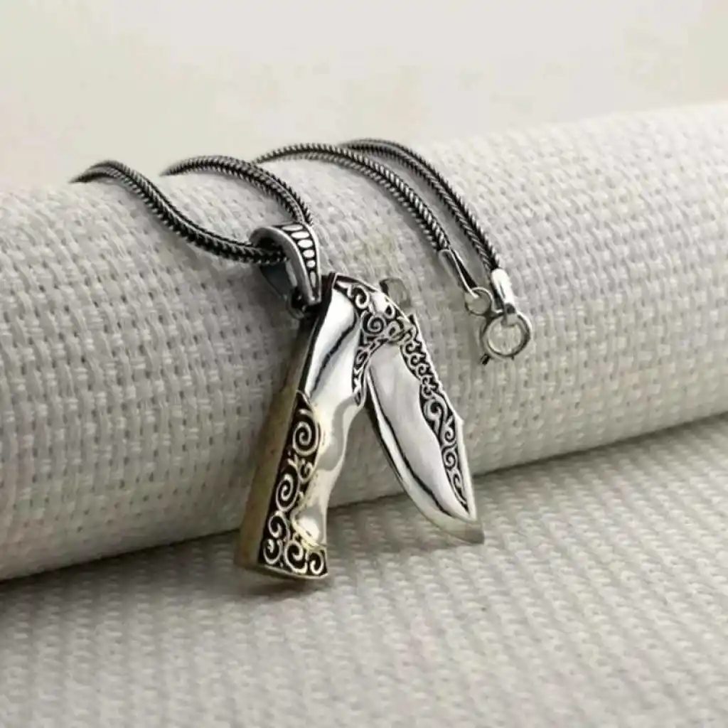 Av bıçağı, avcılar için özel olarak tasarlanmış keskin ve dayanıklı bir bıçaktır. Avcılıkta en önemli ekipmanlardan biri de av bıçağıdır. Av bıçağı, avcının en yakın dostudur. Av bıçağı, av hayvanının derisini yüzmek, etini kesmek, kemiklerini ayırmak, ateş yakmak, ip kesmek gibi pek çok işe yarar Bu kolye 925 ayar gümüşten imal edilmiştir. Gümüş üzerine oksit kaplama yapılmıştır. Oksit kaplama yapılan gümüş kolye modelleri parlaklığını uzun süre muhafaza eder ve oksitlenmesi gecikir. Bu avcı bıçağı kolye de diğer gümüş kolye modellerinde olduğu gibi el emeği ile üretilmiştir. Gümüş ve değerli taşlar nedeniyle belirtilen ürün ağırlığında ± %10 sapma olabilmektedir.