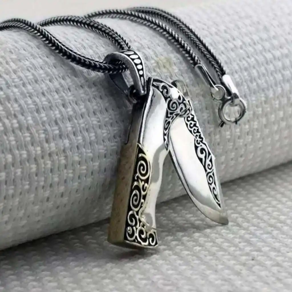 Av bıçağı, avcılar için özel olarak tasarlanmış keskin ve dayanıklı bir bıçaktır. Avcılıkta en önemli ekipmanlardan biri de av bıçağıdır. Av bıçağı, avcının en yakın dostudur. Av bıçağı, av hayvanının derisini yüzmek, etini kesmek, kemiklerini ayırmak, ateş yakmak, ip kesmek gibi pek çok işe yarar Bu kolye 925 ayar gümüşten imal edilmiştir. Gümüş üzerine oksit kaplama yapılmıştır. Oksit kaplama yapılan gümüş kolye modelleri parlaklığını uzun süre muhafaza eder ve oksitlenmesi gecikir. Bu avcı bıçağı kolye de diğer gümüş kolye modellerinde olduğu gibi el emeği ile üretilmiştir. Gümüş ve değerli taşlar nedeniyle belirtilen ürün ağırlığında ± %10 sapma olabilmektedir.