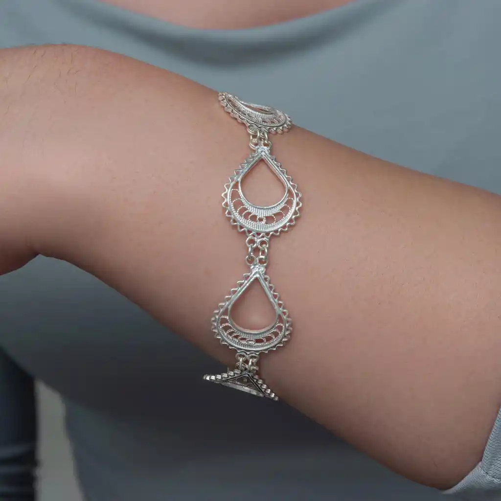 Zarafetin ve el işçiliğinin en ince detaylarla buluştuğu Gümüş Ay Dansı Telkari Kadın Bileklik, geleneksel telkari sanatının modern dokunuşlarla yeniden yorumlanmış özel bir tasarımıdır. Ay formunu andıran damla şekilli motifler, ustaca işlenmiş telkari desenlerle bir araya gelerek bileğe şık ve göz alıcı bir duruş kazandırır.925 ayar gümüşten üretilen bileklik, hafif yapısı sayesinde gün boyu rahat kullanım sunarken parlak ve estetik görünümüyle hem günlük kombinlere hem de özel günlere kolayca uyum sağlar. Zincir ayar bölümü sayesinde farklı bilek ölçülerine uygun şekilde takılabilir ve uzun süre ilk günkü ışıltısını korur.El emeği, ince işçilik ve zamansız şıklığı bir arada sunan bu özel tasarım; sevdiklerine anlamlı bir hediye arayanlar ya da kendi stiline zarif bir dokunuş eklemek isteyenler için benzersiz bir seçenektir.Gümüş ve değerli taşlar nedeniyle belirtilen ortalama ürün ağırlığında ± %10 sapma olabilmektedir.