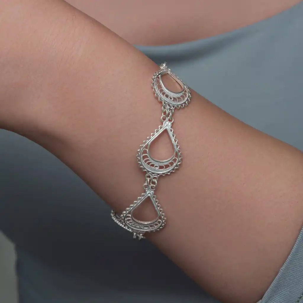 Zarafetin ve el işçiliğinin en ince detaylarla buluştuğu Gümüş Ay Dansı Telkari Kadın Bileklik, geleneksel telkari sanatının modern dokunuşlarla yeniden yorumlanmış özel bir tasarımıdır. Ay formunu andıran damla şekilli motifler, ustaca işlenmiş telkari desenlerle bir araya gelerek bileğe şık ve göz alıcı bir duruş kazandırır.925 ayar gümüşten üretilen bileklik, hafif yapısı sayesinde gün boyu rahat kullanım sunarken parlak ve estetik görünümüyle hem günlük kombinlere hem de özel günlere kolayca uyum sağlar. Zincir ayar bölümü sayesinde farklı bilek ölçülerine uygun şekilde takılabilir ve uzun süre ilk günkü ışıltısını korur.El emeği, ince işçilik ve zamansız şıklığı bir arada sunan bu özel tasarım; sevdiklerine anlamlı bir hediye arayanlar ya da kendi stiline zarif bir dokunuş eklemek isteyenler için benzersiz bir seçenektir.Gümüş ve değerli taşlar nedeniyle belirtilen ortalama ürün ağırlığında ± %10 sapma olabilmektedir.