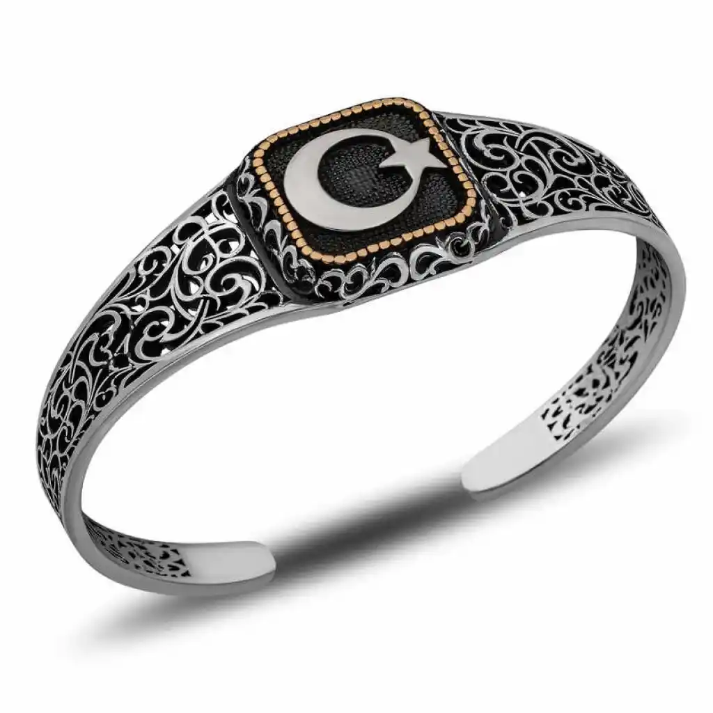 Ay yıldız sembolü, Türk kültüründe önemli bir yere sahiptir ve genellikle milliyetçilik, Türklük, İslam ve bağımsızlık gibi kavramlarla ilişkilendirilir. Ayarlanabilir erkek bilekliklerde kullanılması, bu sembolü taşıyan kişinin bu değerlere bağlılığını veya bu değerleri temsil etme arzusunu gösterebilir.Gümüş bileklik; doğum günü hediyesi, sevgililer günü hediyesi veya diğer özel günlerde hediye olarak tercih edilebilecek mükemmel bir seçenektir.Gümüş üzerine oksit kaplama yapılmıştır. Oksit kaplama yapılan gümüş bileklikler parlaklığını uzun süre muhafaza eder. Gümüş ve değerli taşlar nedeniyle belirtilen ortalama ürün ağırlığında ± %10 sapma olabilmektedir.