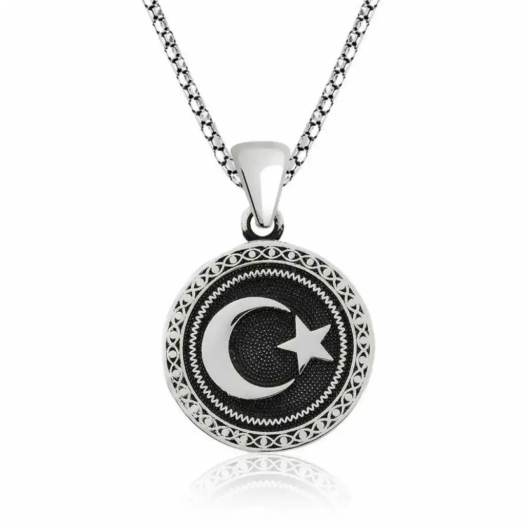 Türk Bayrağının rengini şehitlerin kanından ilhamını da kan gölüne yansıyan ay ve yıldızdan aldığını biliyoruz. Bayrağın taşıdığı kutsal anlamı teninizde taşımak ve sevdiklerinizle paylaşmak için kaçırılmayacak bir fırsat. Ay yıldız kolye 925 ayar gümüşten imal edilmiştir. Gümüş üzerine oksit kaplama yapılmıştır. Oksit kaplama gümüşü siyah renge dönüştürür. Tüm kolye modellerinde olduğu gibi ay yıldız kolye de el emeği ile üretilmiştir. Gümüş ve değerli taşlar nedeniyle belirtilen ortalama ürün ağırlığında ± %10 sapma olabilmektedir.