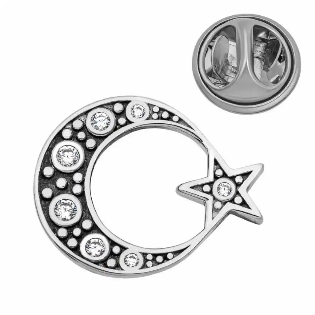 Türk bayrağının ilhamını kan gölüne yansıyan ay ve yıldızdan aldığını biliyoruz. Bayrağın taşıdığı kutsal anlamı taşımak ve sevdiklerinizle paylaşmak için kaçırılmayacak bir fırsat sunuyoruz. Bu şık rozet; doğum günü, babalar günü veya özel günlerde tercih edilebilecek mükemmel bir hediye seçeneğidir. Bu rozet modeli 925 ayar gümüşten imal edilmiştir. Gümüş üzerine rodyum kaplama yapılmıştır. Rodyum kaplama yapılan gümüş rozet modelleri parlaklığını uzun süre muhafa eder, oksitlenmesi gecikir. Tüm gümüş rozetlerde olduğu gibi gümüş ay yıldız rozet modeli de tamamen el emeği ile üretilmiştir. Gümüş ve değerli taşlar nedeniyle belirtilen ortalama ürün ağırlığında ± %10 sapma olabilmektedir.