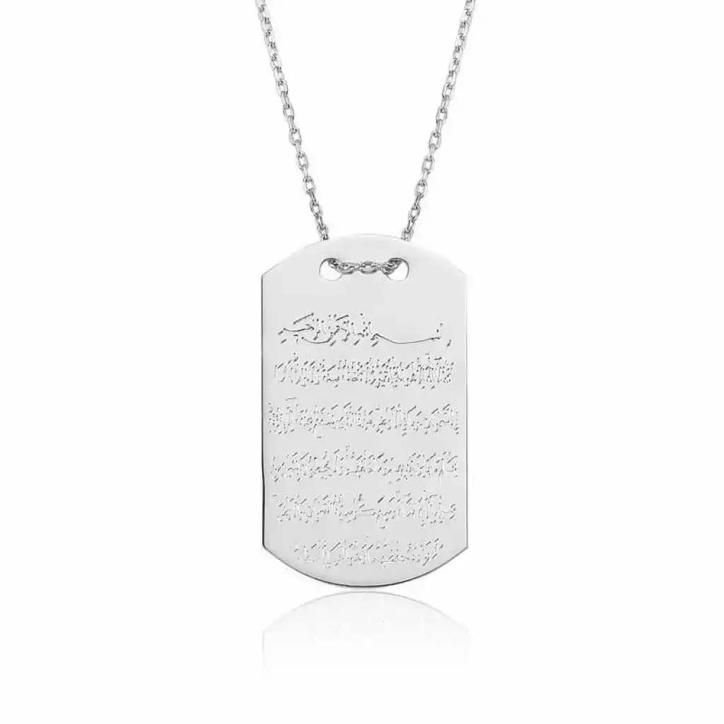 Ayetel kürsi kuran’ı kerimde 2. Süre olan Bakara süresinin 255. ayetidir. İsmini ayet içinde geçen “kürsiyuhus semeveti” kelimesindeki kürsiden almıştır. Bu dua namazda fatiha süresinden sonra okunabileceği gibi Allah"ı tesbih etme ya da dua etme amacıyla da okunabilir. Ayete-l Kürsi Fazileti; Allah ki, O’ndan başka ilah yoktur. O Hayydır, Kayyûm"dur. Kendisine ne uyku gelir ne de uyuklama. Göklerde ve yerdekilerin hepsi O’nundur. O’nun izni olmadan katında kim şefaat edebilir? O, kullarının yaptıklarını ve yapacaklarını bilir. (Hiçbir şey O’na gizli kalmaz.) O’nun bildirdiklerinin dışında insanlar, O’nun ilminden hiçbir şeyi tam olarak bilemezler. O’nun kürsüsü gökleri ve yeri içine alır, onları koruyup gözetmek kendisine zor gelmez. O, yücedir, büyüktür. Ayetel Kürsi Kolye modeli 925 ayar gümüşten imal edilmiştir. Gümüş üzerine rodyum kaplama yapılmıştır. Rodyum kaplama yapılan gümüş bayan kolye modelleri parlaklığını uzun süre muhafaza eder ve oksitlenmesi gecikir. Gümüş olan zincir boyu ortalama 45 cm"dir. Gümüş Ayetel Kürsi yazılı bayan kolye modeli gibi tüm gümüş kolye modelleri el emeği ile üretilmiştir. Gümüş ve değerli taşlar nedeniyle belirtilen ortalama ürün ağırlığında ± %10 sapma olabilmektedir.