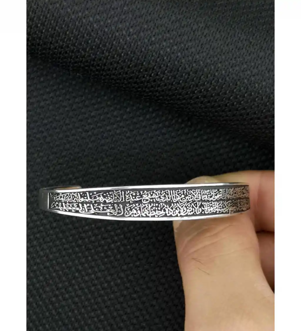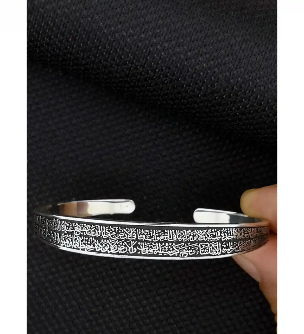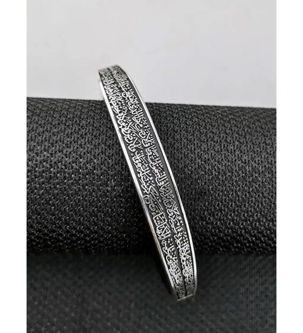 Ayetel Kürsi, İslam inancında Kur"an-ı Kerim"in en önemli ayetlerinden biri olarak kabul edilir. İçeriğinde Allah"ın eşsiz sıfatları, kudreti ve evren üzerindeki hükümranlığı anlatılır. Bu nedenle, Ayetel Kürsi"nin yazılı olduğu bir bileklik takmak, taşıyan kişiye manevi bir koruma sağladığına, onu kötülüklerden ve nazardan koruduğuna inanılır.Ayetel Kürsi"nin okunması ve taşınması, kişiye iç huzuru, güven ve sükunet verir. Gümüş bileklik; doğum günü hediyesi, sevgililer günü hediyesi veya diğer özel günlerde hediye olarak tercih edilebilecek mükemmel bir seçenektir.Gümüş üzerine oksit kaplama yapılmıştır. Oksit kaplama yapılan gümüş bileklikler parlaklığını uzun süre muhafaza eder. Gümüş ve değerli taşlar nedeniyle belirtilen ortalama ürün ağırlığında ± %10 sapma olabilmektedir.