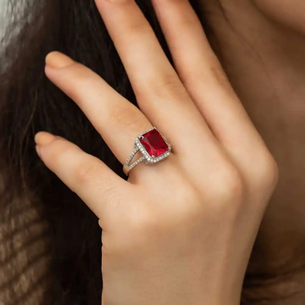 Gümüş Kırmızı Baget Kare Bayan Yüzük