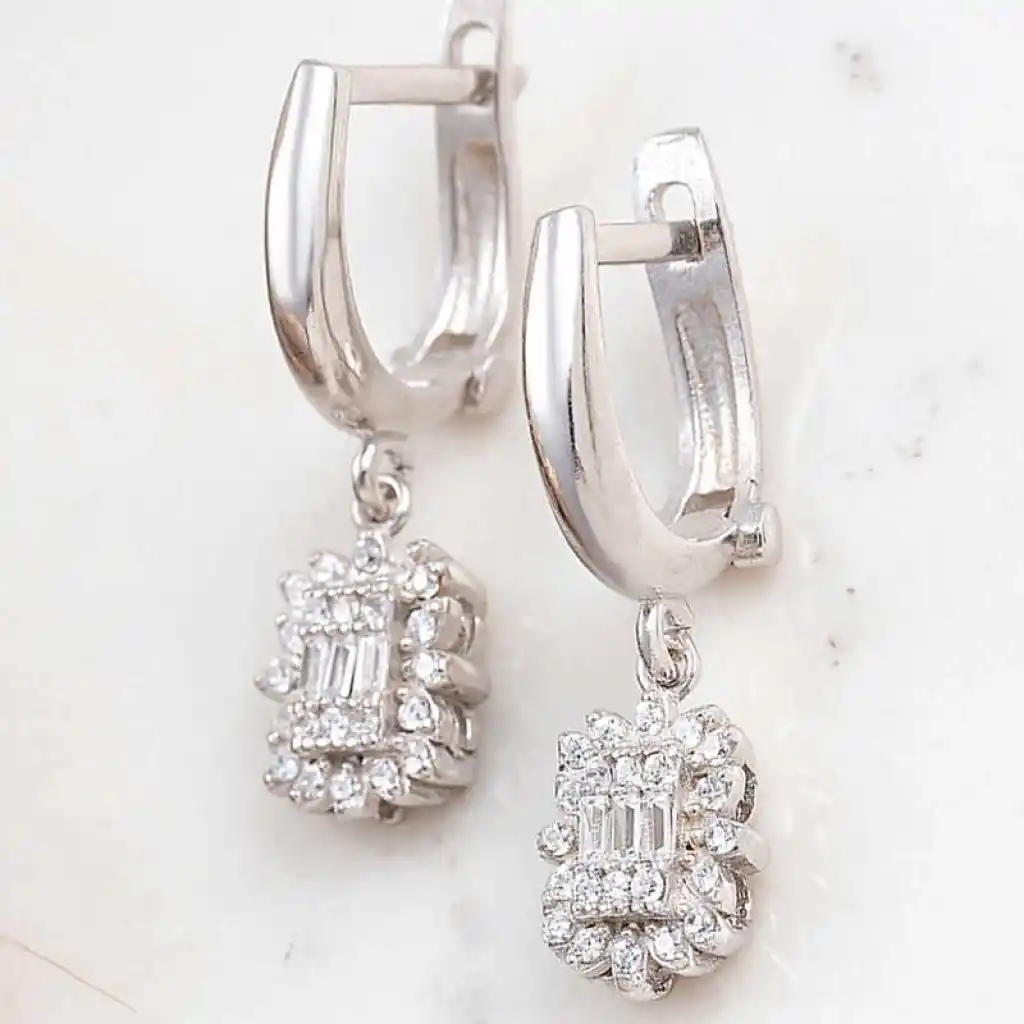 Modası hiçbir zaman geçmeyecek olan baget taşlı kadın küpe, günümüz takıları ile farklı stillerde yeniden yorumlanıyor. Zirkonun göz alıcı ışıltısı, sizi de saracak. Sizin olduğu kadar sevdiklerinizin de keyifle takacağı bu gümüş baget taşlı kadın küpe, aynı zamanda sevginizi paylaşabileceğiniz en güzel hediyelerden biri olacaktır. 925 ayar gümüşten imal edilmiştir. Gümüş üzerine rodyum kaplama yapılmıştır. Rodyum kaplama yapılan ürünler parlaklığını uzun süre muhafaza eder, oksitlenmesi gecikir. Üzerinde bulunan taşlar zirkon ve bagettir Gümüş küpelerin tamamında olduğu gibi gümüş baget taşlı kadın küpe de el emeği ile üretilmiştir. Gümüş ve değerli taşlar nedeniyle belirtilen ortalama ürün ağırlığında ± %10 sapma olabilmektedir.