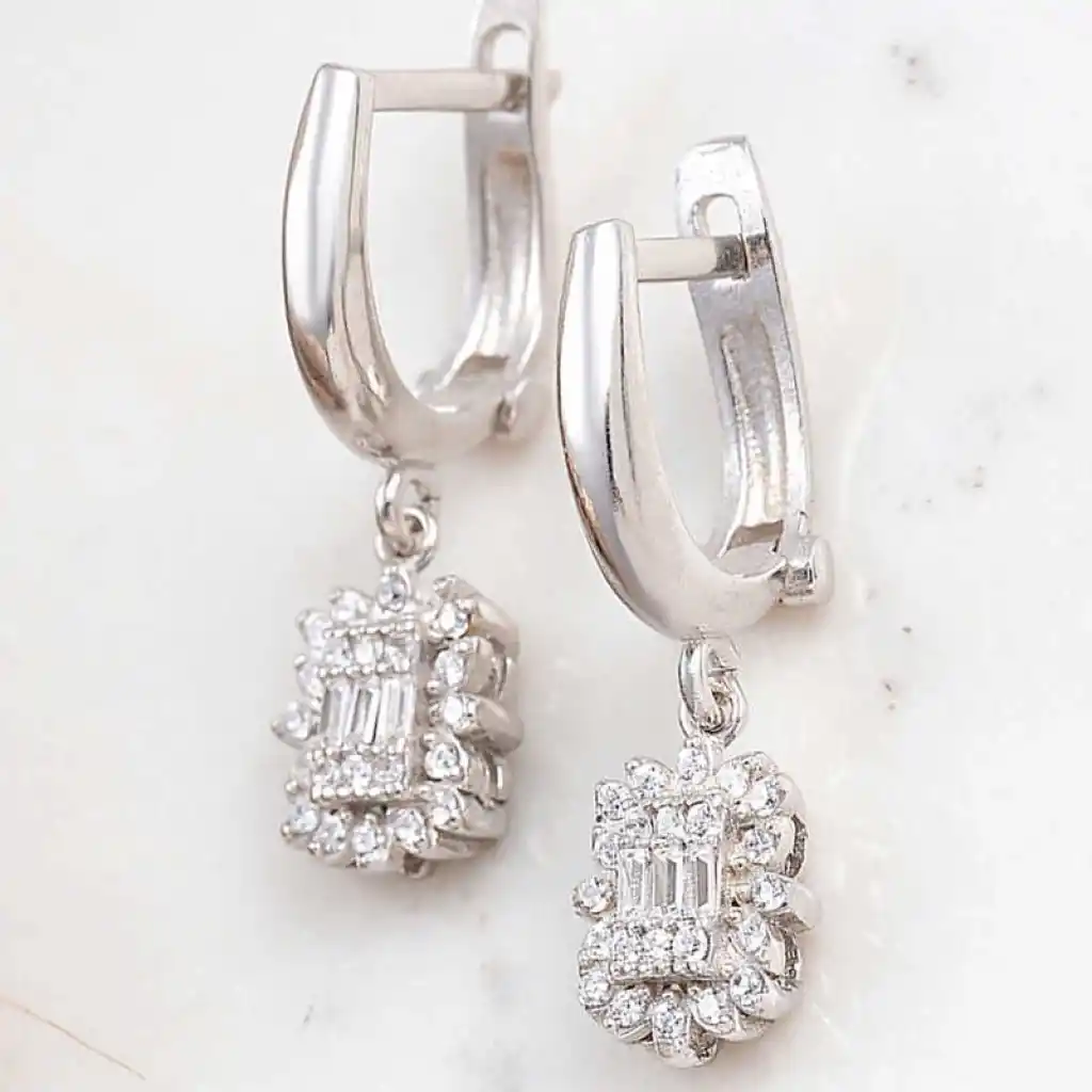 Modası hiçbir zaman geçmeyecek olan baget taşlı kadın küpe, günümüz takıları ile farklı stillerde yeniden yorumlanıyor. Zirkonun göz alıcı ışıltısı, sizi de saracak. Sizin olduğu kadar sevdiklerinizin de keyifle takacağı bu gümüş baget taşlı kadın küpe, aynı zamanda sevginizi paylaşabileceğiniz en güzel hediyelerden biri olacaktır. 925 ayar gümüşten imal edilmiştir. Gümüş üzerine rodyum kaplama yapılmıştır. Rodyum kaplama yapılan ürünler parlaklığını uzun süre muhafaza eder, oksitlenmesi gecikir. Üzerinde bulunan taşlar zirkon ve bagettir Gümüş küpelerin tamamında olduğu gibi gümüş baget taşlı kadın küpe de el emeği ile üretilmiştir. Gümüş ve değerli taşlar nedeniyle belirtilen ortalama ürün ağırlığında ± %10 sapma olabilmektedir.