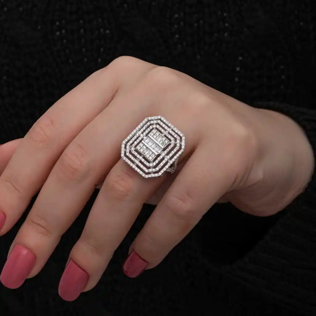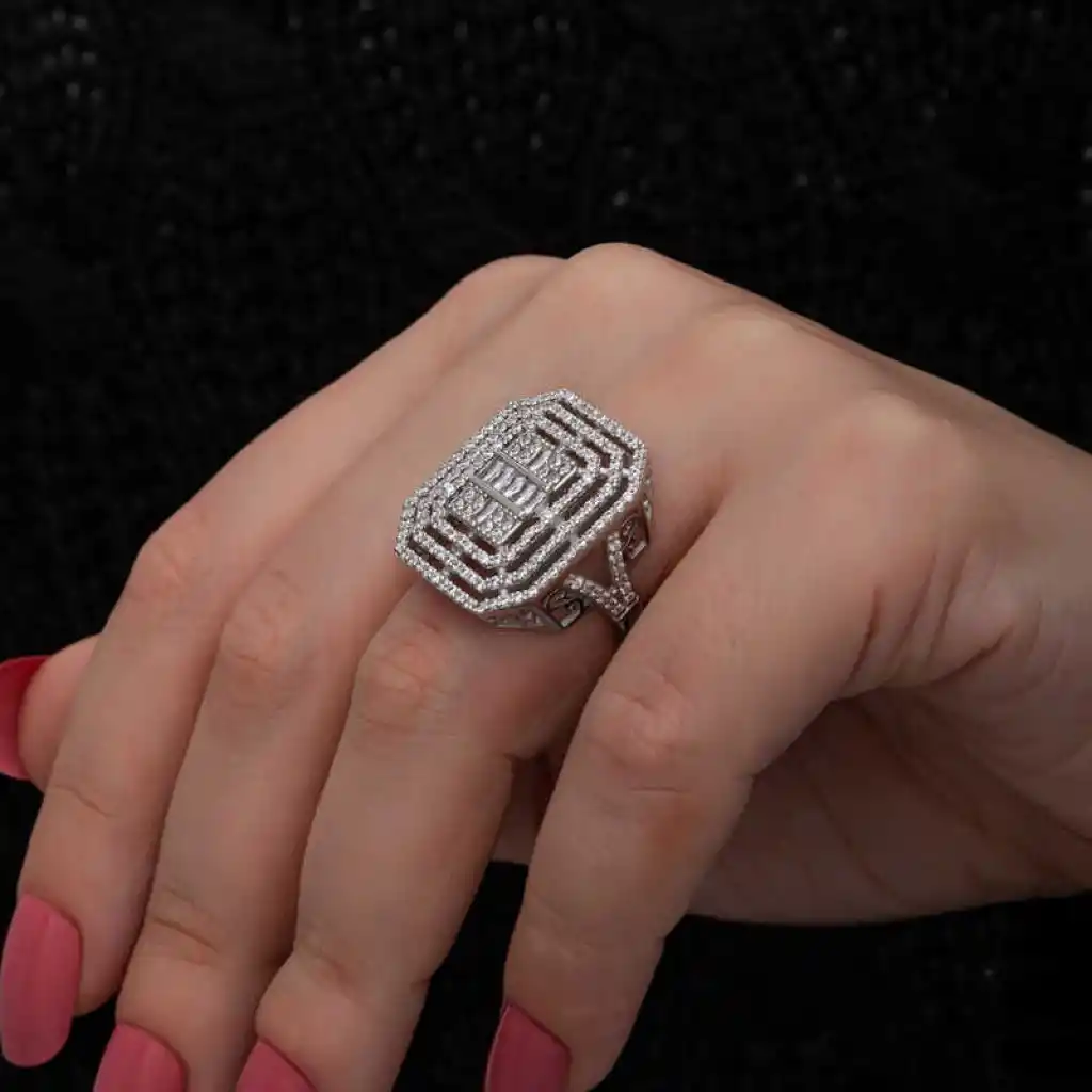 Işıl ışıl baget ve zirkon taşlarla süslenmiş bu şık yüzük modeli; doğum günü hediyesi, sevgililer günü hediyesi veya annelere hediye olarak özel günlerde tercih edebileceğiniz çok şık bir seçenektir. Yüzük 925 ayar gümüşten imal edilmiştir. Gümüş üzerine rodyum kaplama yapılmıştır. Rodyum kaplama yapılan gümüş yüzükler parlaklığını uzun süre muhafaza eder, oksitlenmesi gecikir. Tüm kadın gümüş yüzüklerde olduğu gibi gümüş baget taşlı kadın yüzük modeli de el emeği ile üretilmiştir. Gümüş ve değerli taşlar nedeniyle belirtilen ortalama ürün ağırlığında ± %10 sapma olabilmektedir.
