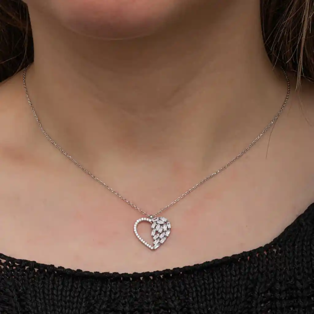 Kalp simgesi daima koşulsuz sevginin ve aşkın sembolü olmuştur. Dini öğretilerde ise kalbin gücü sınırsızdır. Çünkü kalp Yaradanın evi, bizim ise evrene açılan gerçeklik kapımızdır. Bu şık gümüş kalp kolye; doğum günü hediyesi, sevgililer günü hediyesi veya annelere hediye olarak özel günlerde tercih edilebilecek mükemmel bir seçenektir. Gümüş kalp kadın kolye 925 ayar gümüşten imal edilmiştir. Bu kolye üzerinde rodyum kaplama yapılmıştır. Rodyum kaplama yapılan gümüş kadın kolye modelleri parlaklığını uzun süre muhafaza eder. Üzerinde bulunan taşlar zirkon ve bagettir. Tüm gümüş kadın kolye modellerimizde olduğu gibi gümüş kalp kadın kolye modeli de el emeği ile üretilmiştir. Gümüş ve değerli taşlar nedeniyle belirtilen ortalama ürün ağırlığında ± %10 sapma olabilmektedir.