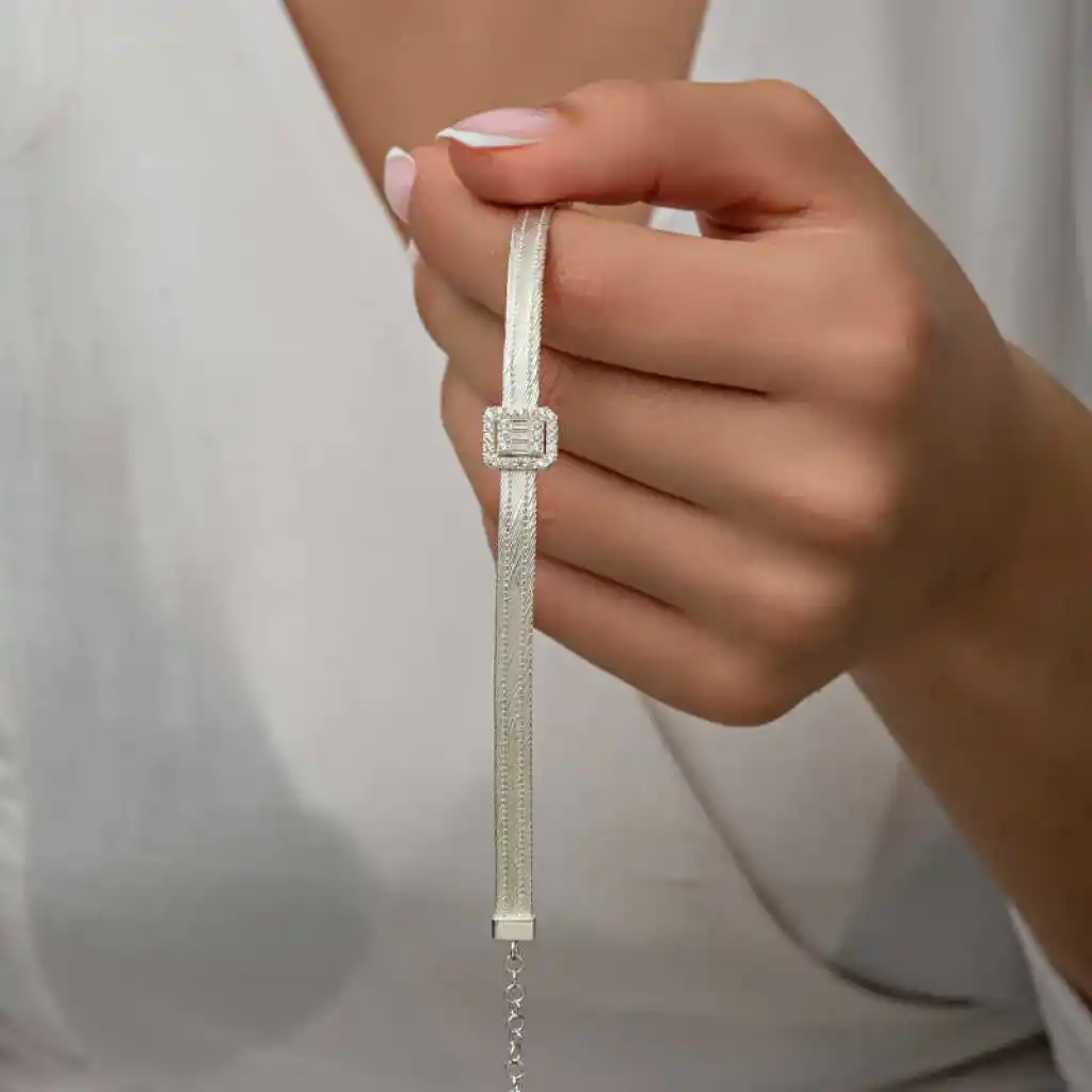 Modaya uyumlu şekilde tasarlanan gümüş baget taşlı trabzon hasır bileklik modellerini hem gündelik yaşantınızda hem özel gün ve gecelerinizde şık bir şekilde kullanabilirsiniz. Yenilikçi her yaştan kadının beğenisine hitap eden ürünlerle kombinlerinizi tamamlayabilirsiniz.Bu şık bileklik; doğum günü hediyesi, sevgililer günü hediyesi veya özel günlerde tercih edilebilecek mükemmel bir seçenektir. Gümüş baget taşlı trabzon hasır kadın bileklik 925 ayar gümüşten imal edilmiştir. Bu bileklik üzerinde rodyum kaplama vardır. Rodyum kaplama yapılan ürünler parlaklığını uzun süre muhafaza eder, oksitlenmesini geciktirir. Tüm gümüş kadın bileklik modellerinde olduğu gibi gümüş baget taşlı trabzon hasır kadın bileklik modeli de el emeği ile üretilmiştir. Gümüş ve değerli taşlar nedeniyle belirtilen ortalama ürün ağırlığında ± %10 sapma olabilmektedir.