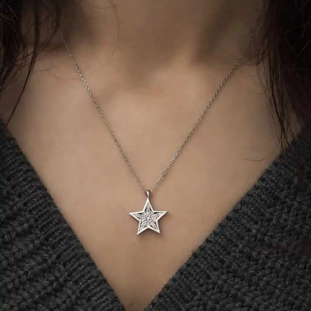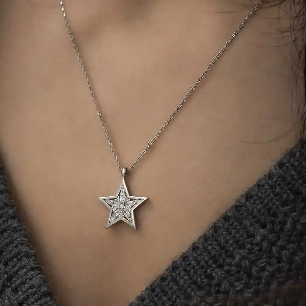 Yıldız, pek çok toplumda ve öğretide şans getirildiğine inanılan uğurlu bir semboldür. Venüs Gezegeninin enerjisini taşır. Venüs Gezegeni, aşk ve aşk enerjisinin de temsilcisidir. Bu şık baget taşlardan oluşan yıldız kolye; doğum günü hediyesi, sevgililer günü hediyesi veya özel günlerde tercih edilebilecek mükemmel bir seçenektir. Gümüş baget taşlı yıldız bayan kolye 925 ayar gümüşten imal edilmiştir. Bu kolye üzerinde rodyum kaplama vardır. Rodyum kaplama yapılan gümüş bayan kolye modelleri parlaklığını uzun süre muhafaza eder. Tüm gümüş bayan kolye modellerimizde olduğu gibi gümüş baget taşlı yıldız bayan kolye modeli de el emeği ile üretilmiştir. Gümüş ve değerli taşlar nedeniyle belirtilen ortalama ürün ağırlığında ± %10 sapma olabilmektedir.