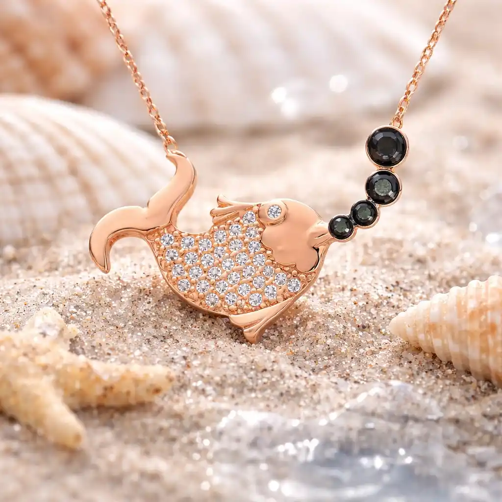 Bereket figürü olan balık pek çok kültürde şans simgesi olarak kullanılmaktadır. Balık sembolü, bilgelik ve yeniden hayat bulma ile ilgi anlamlar da içermektedir. Suyun içinde her yöne özgürce hareket etmeleri, akıntıya karşı yüzmeleri, refahın ve zenginliğin sembolüdür. Balıklar aynı zamanda kendini yola adayanların ve hayatın sularında yüzen bayanları ifade etmektedir. Sevdikleriniz için bu sevimli ve anlamlı kolyeyi hediye edebilirsiniz. Balık bayan kolye 925 ayar gümüşten imal edilmiştir. Gümüş üzerine rose altın kaplama yapılmıştır. Rose altın kaplama yapılan gümüş bayan kolye modelleri parlaklığını uzun süre muhafaza eder ve oksitlenmesi gecikir. Kolye üzerinde bulunan taşlar zirkondur. Gümüş olan zincir boyu ortalama 45 cm"dir. Tüm gümüş bayan kolye modellerinde olduğu gibi gümüş balık bayan kolye el emeği ile üretilmiştir. Gümüş ve değerli taşlar nedeniyle belirtilen ürün ağırlığında ± %10 sapma olabilmektedir.
