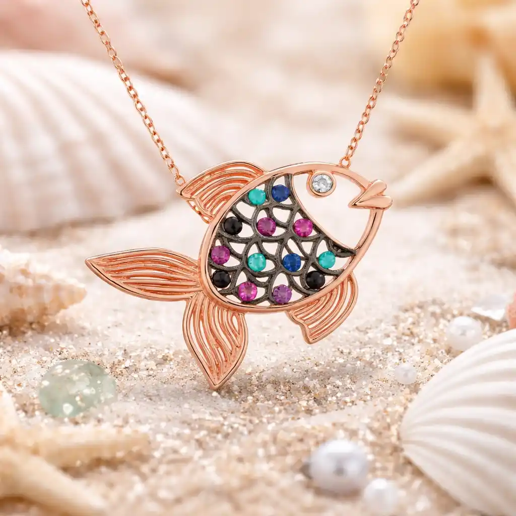Balık kültürlerin bir çoğunda şansı ve bereketi sembolize eder. Ayrıca balık doğa hayatına ait birçok anlamı bünyesinde barındırır. Akıntıya karşı yüzmeleri, fazla sayıda doğurmaları ve özgürce hareket etmeleri... Bunun gibi pek çok mana yüklü olan balık sembolünü, şık tasarımıyla karşımızda... Rengarenk olarak karşımıza çıkan gümüş balık bayan kolyeyi; doğum günü hediyesi, sevgililer günü hediyesi veya annelere hediye olarak özel günlerde tercih edilebilecek mükemmel bir seçenektir. Gümüş balık bayan kolye 925 ayar gümüşten imal edilmiştir. Gümüş üzerine rose kaplama yapılmıştır. Rose kaplama yapılan bayan kolyeler parlaklığını uzun süre muhafaza eder, gümüş rengini pembe renge dönüştürür ve oksitlenmeyi geciktirir. Üzerinde bulunan taşlar zirkondur. Zincir boyu ortalama 45 cm"dir. Bayan kolyelerimizin tamamı el emeği ile üretilmiştir. Gümüş ve değerli taşlar nedeniyle ürün ağırlığında ± %10 sapma olabilmektedir.