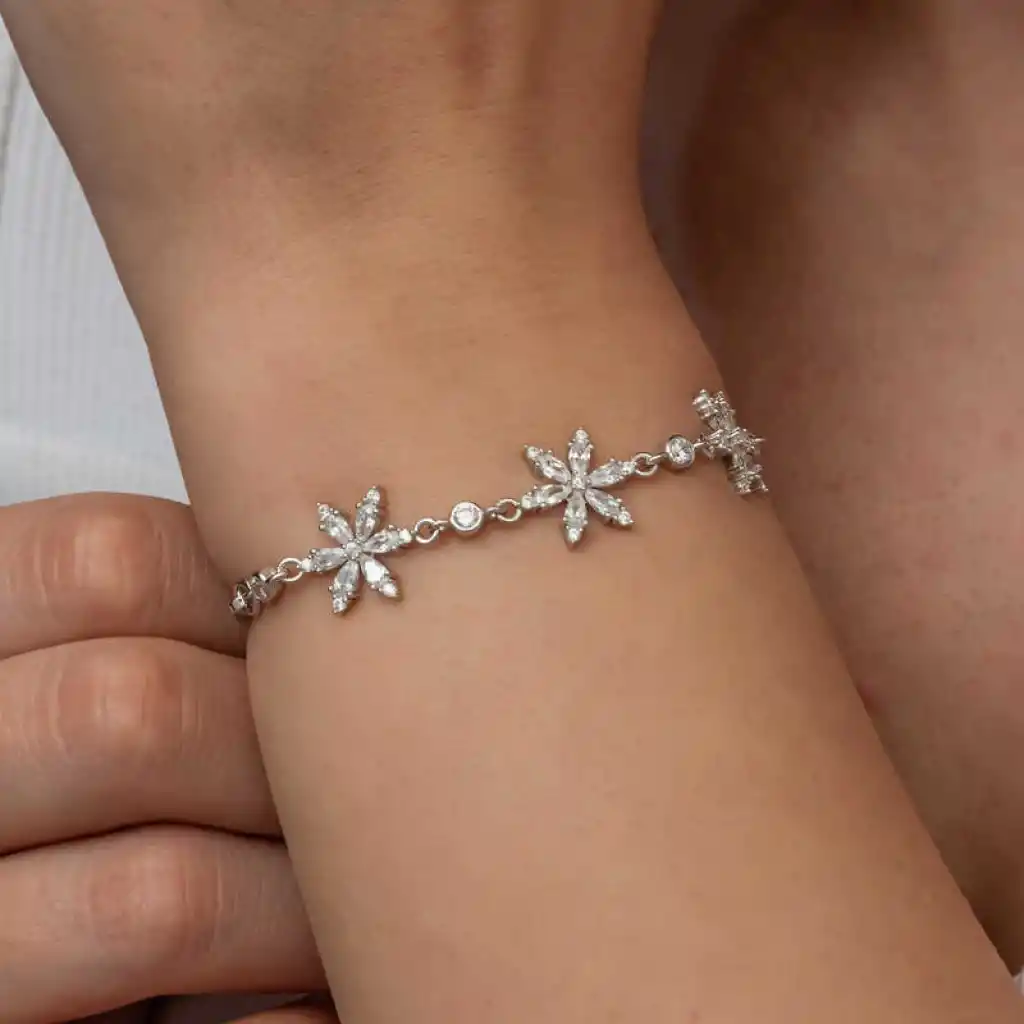 Beyaz Lotus Çiçeği Kadın Bileklik, zarif bir tasarıma sahip olan ve hem estetik hem de anlam derinliği taşıyan bir aksesuardır. Lotus çiçeği, birçok kültürde saflığın, yenilenmenin ve ruhsal büyümenin sembolü olarak kabul edilir. Bu bileklik, şıklığı ve zarafetiyle ön planda olup, günlük kullanımda veya özel etkinliklerde rahatlıkla takılabilir.Gümüş üzerine rodyum kaplama yapılmıştır. Rodyum kaplama yapılan beyaz lotus çiçeği kadın bileklik modelleri parlaklığını uzun süre muhafaza eder.Gümüş ve değerli taşlar nedeniyle belirtilen ortalama ürün ağırlığında ± %10 sapma olabilmektedir.