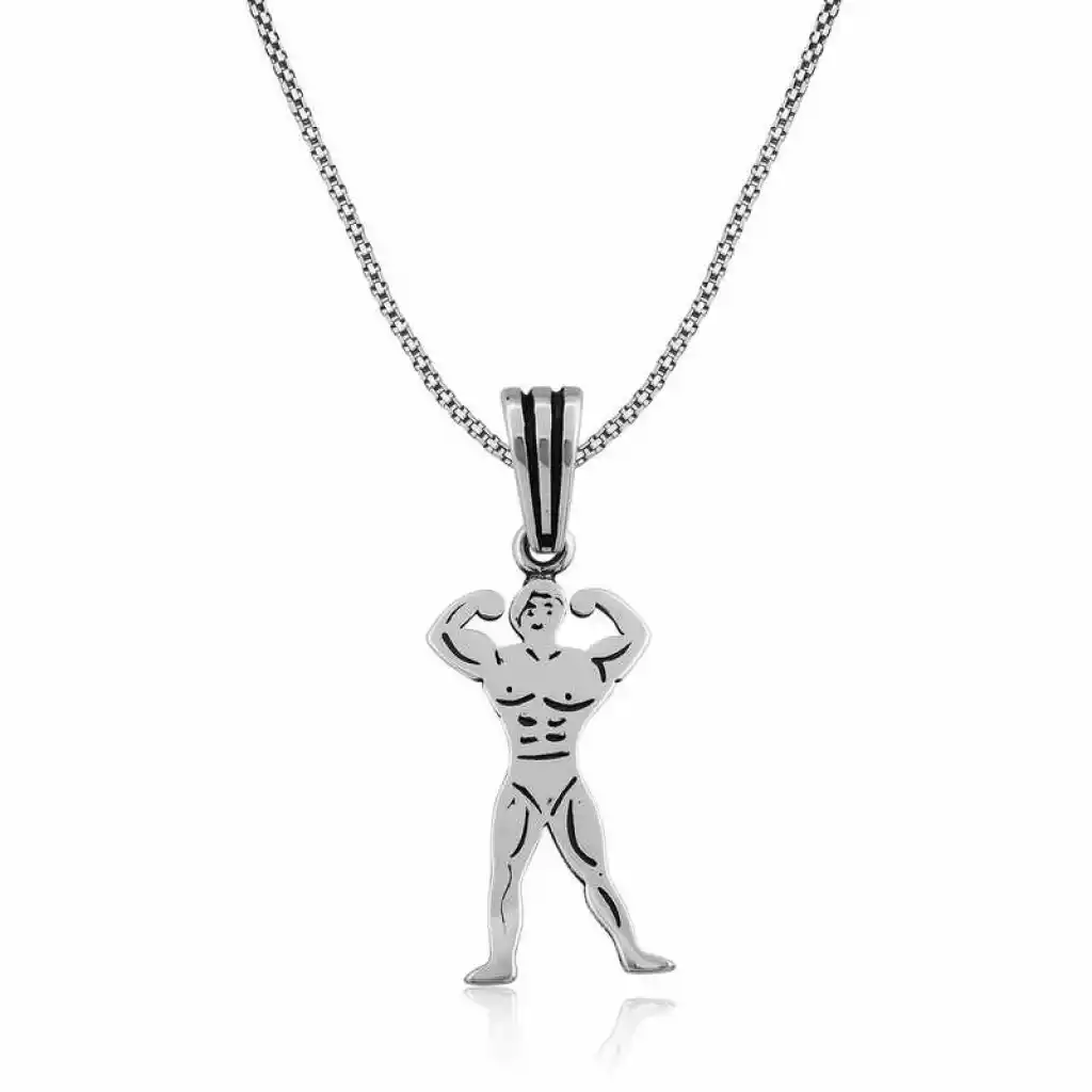 Kaslı erkek figürlü kolye; spor severlerin ve body yapanların severek kullanacağı ürün 925 ayar gümüşten imal edilmiştir. Gümüş üzerine rodyum kaplama yapılmıştır. Rodyum kaplama yapılan modeller parlaklığını uzun süre muhafaza eder ve oksitlenmesi gecikir. Gümüş bady figürlü erkek kolye el emeği ile üretilmiştir. Gümüş ve değerli taşlar nedeniyle ürün ağırlığında ± %10 sapma olabilmektedir.