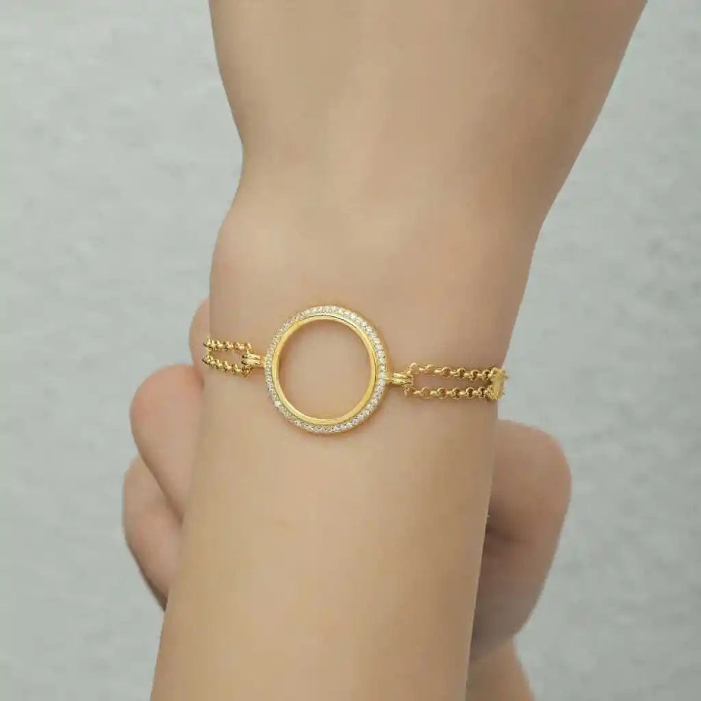 Yuvarlak form deseniyle şıklığı ifade eden gümüş çeyrek takılabilen altın kadın bileklik modeli ile sevginiz, sevdiğiniz kadının teninde hayat bulsun. Genç sevgililerin ve kendini genç hissedenlerin özel günlerde de seçebileceği bu kadın bileklik modeli ile sevdiğinizin bileğini aşkla süsleyin. Sizin olduğu kadar sevdiklerinizin de keyifle takacağı kadın bileklik sevdiğinize en güzel hediyelerden biri olacaktır. Bu kadın bileklik modeli 925 ayar gümüşten imal edilmiştir. Gümüş üzerine altın kaplama yapılmıştır. Altın kaplama yapılan gümüş kadın bileklik modelleri parlaklığını uzun süre muhafaza eder ve oksitlenmesi gecikir. Bileklik üzerinde bulunan beyaz taşlar zirkondur. Tüm kadın bileklik modellerinde olduğu gibi gümüş kadın bileklik modeli de el emeği ile üretilmiştir. Gümüş ve değerli taşlar nedeniyle belirtilen ortalama ürün ağırlığında ± %10 sapma olabilmektedir.