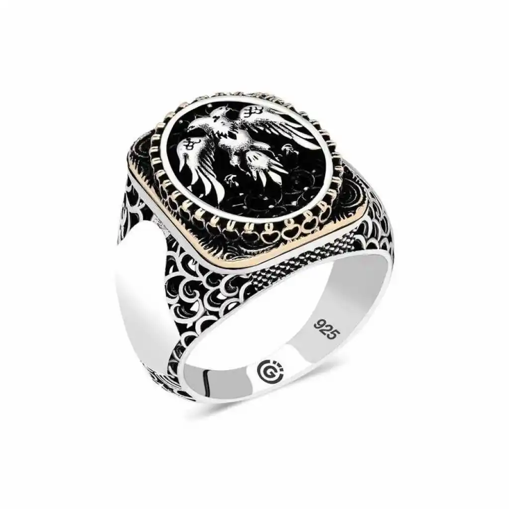 Gümüş üzerindeki çift başlı kartal oval erkek yüzük modeli günün her anında kullanabileceğiniz şık bir aksesuardır. Bu yüzüğü; kendinize ya da sevdiklerinize doğum gününde, babalar gününde ya da özel günlerde hediye edebilirsiniz. Çift başlı kartal oval erkek yüzük modeli 925 ayar gümüşten imal edilmiştir. Gümüş üzerine oksit kaplama yapılmıştır. Oksit kaplama yapılan gümüş erkek yüzük modelleri parlaklığını uzun süre muhafaza eder. Tüm erkek yüzüklerde olduğu gibi gümüş çift başlı oval erkek yüzük modeli de el emeği ile üretilmiştir. Gümüş ve değerli taşlar nedeniyle belirtilen ortalama ürün ağırlığında ± %10 sapma olabilmektedir.