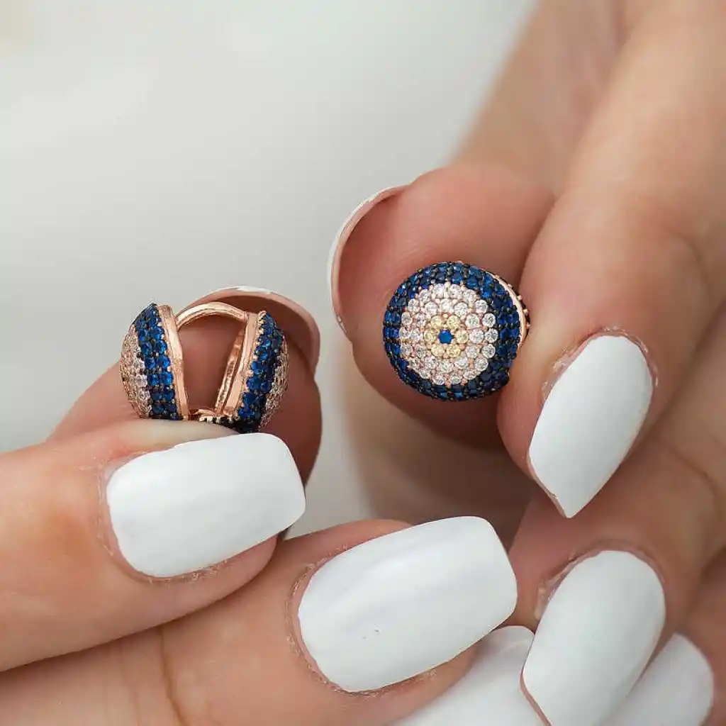 Nazar boncuğunu insanlar uzun yıllardan beri kötü bakıştan korunmak için kullanmışlardır. Kötü bakışların insanlar üzerinde olumsuz etki oluşturmasına karşı bir önlemdir nazar boncuğu… Bu sebeptendir ki insanlar sevdiklerini korumak için nazar boncuğu takmaktadır. Bu nazar küpe de şıklığı ve zarafeti yansıtıyor. Her dönem sevilen ve şıklığından ödün vermeyen bu modeli; doğum günü hediyesi, sevgililer günü hediyesi veya annelere hediye olarak özel günlerde tercih edebilirsiniz. Gümüş çift taraflı nazarlı bayan küpe, 925 ayar gümüşten imal edilmiştir. Gümüş üzerine rose kaplama yapılmıştır. Rose altın kaplama yapılan gümüş bayan bileklikler parlaklığını uzun süre muhafaza eder, oksitlenmesi gecikir. Üzerinde bulunan taşlar zirkondur. Tüm gümüş bayan kolyelerinde olduğu gibi bu gümüş çift taraflı nazar bayan küpe modeli de tamamı el emeği ile üretilmiştir. Gümüş ve değerli taşlar nedeniyle belirtilen ortalama ürün ağırlığında ± %10 sapma olabilmektedir.
