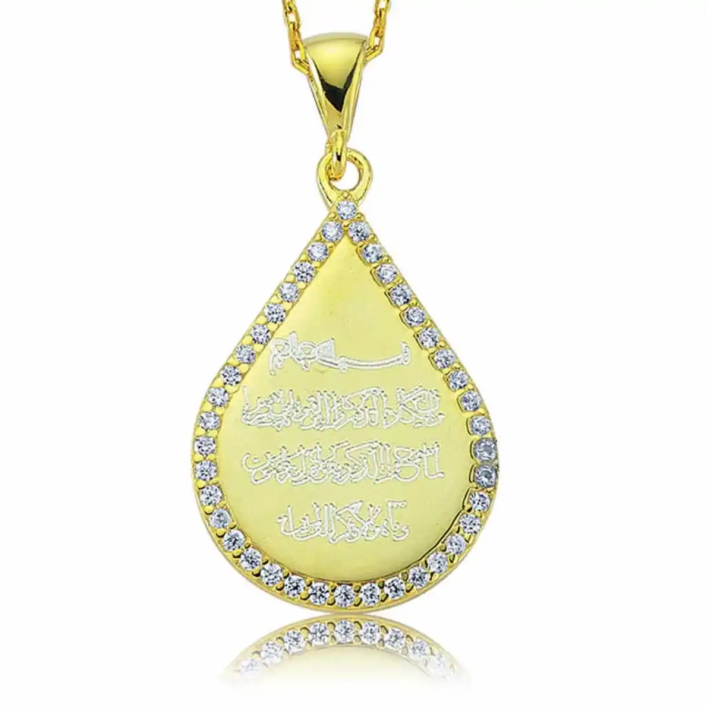 Nazar bakış demektir ve her canlıya nazar değebilmektedir. Bu nazar hastalığından korunmak, şifa bulmak için nazar duası okunur... Bu maneviyatı yüksek kolye; doğum günü hediyesi, sevgililer günü hediyesi veya annelere hediye olarak özel günlerde tercih edilebilecek mükemmel bir seçenektir. Kolye; 925 ayar gümüşten imal edilmiştir. Kolye üzerine altın kaplama yapılmıştır. Altın kaplama yapılan ürünler parlaklığını uzun süre muhafaza eder, gümüşü sarı renge dönüştürür ve oksitlenmeyi geciktirir. Kolye üzerinde bulunan taşlar zirkondur. Tüm gümüş bayan kolyelerde olduğu gibi gümüş taşlı nazar duası bayan kolye modeli de el emeği ile üretilmiştir. Gümüş ve değerli taşlar nedeniyle belirtilen ortalama ürün ağırlığında ± %10 sapma olabilmektedir.