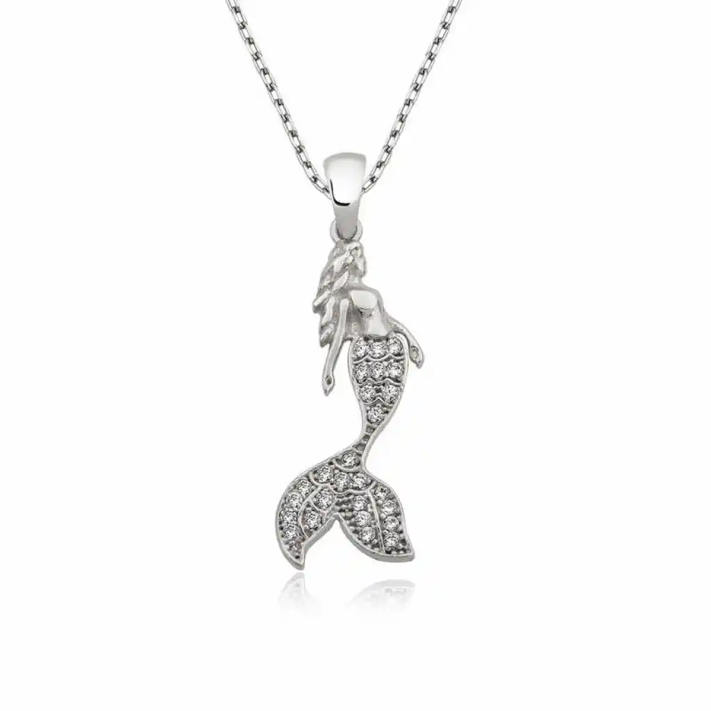 Günlük hayatınızda rahatlıkla kullanabileceğiniz bir model, sade tasarımıyla sevdiklerinize hediye edebileceğiniz kolyelerden biri olabilecek bu gümüş deniz kızı bayan kolye modeli 925 ayar gümüşten imal edilmiştir. Gümüş üzerine rodyum kaplama yapılmıştır. Rodyum kaplama yapılan gümüş bayan kolye modelleri parlaklığını uzun süre muhafaza eder ve oksitlenmesi gecikir. Kolye üzerinde bulunan taşlar zirkondur. Gümüş olan zincirin boyu ortalama 45cm"dir. Tüm gümüş bayan kolye modellerinde olduğu gibi bu deniz kızı bayan kolye modeli de el emeği ile üretilmiştir. Gümüş ve değerli taşlar nedeniyle belirtilen ortalama ürün ağırlığında ± %10 sapma olabilmektedir.