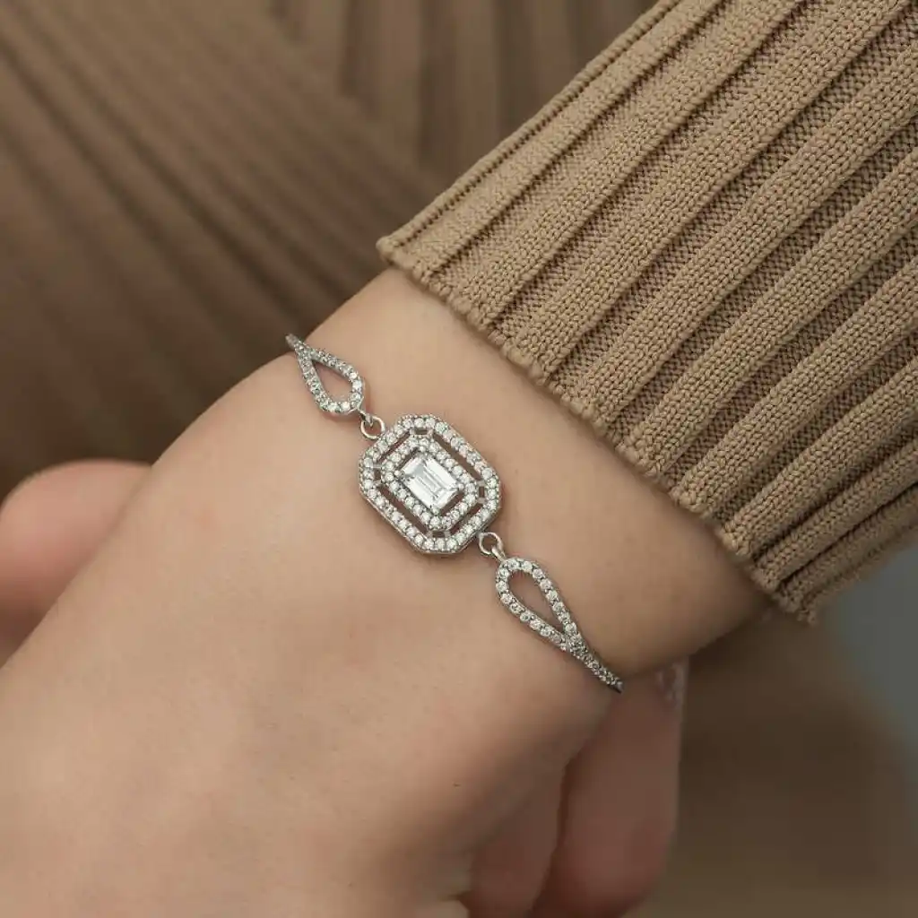 Modaya uyumlu şekilde tasarlanan gümüş baget bileklik modellerini hem gündelik yaşantınızda hem özel gün ve gecelerinizde şık bir şekilde kullanabilirsiniz. Yenilikçi her yaştan kadının beğenisine hitap eden ürünlerle kombinlerinizi tamamlayabilirsiniz. Her biri farklı bir stile hitap edebilen tasarımlarla sizler de spor, klasik ve alternatif giyim tarzlarınıza uygun modellerimizi tercih edebilirsiniz. Bu şık bileklik; doğum günü hediyesi, sevgililer günü hediyesi veya özel günlerde tercih edilebilecek mükemmel bir seçenektir. Gümüş dikdörtgen baget taşlı bayan bileklik 925 ayar gümüşten imal edilmiştir. Bu bileklik üzerine rodyum kaplama yapılmıştır. Rodyum kaplama yapılan ürünler parlaklığını uzun süre muhafaza eder, oksitlenmesini geciktirir. Tüm gümüş bayan bileklik modellerinde olduğu gibi gümüş dikdörtgen baget taşlı bayan bileklik modeli de el emeği ile üretilmiştir. Gümüş ve değerli taşlar nedeniyle belirtilen ortalama ürün ağırlığında ± %10 sapma olabilmektedir.