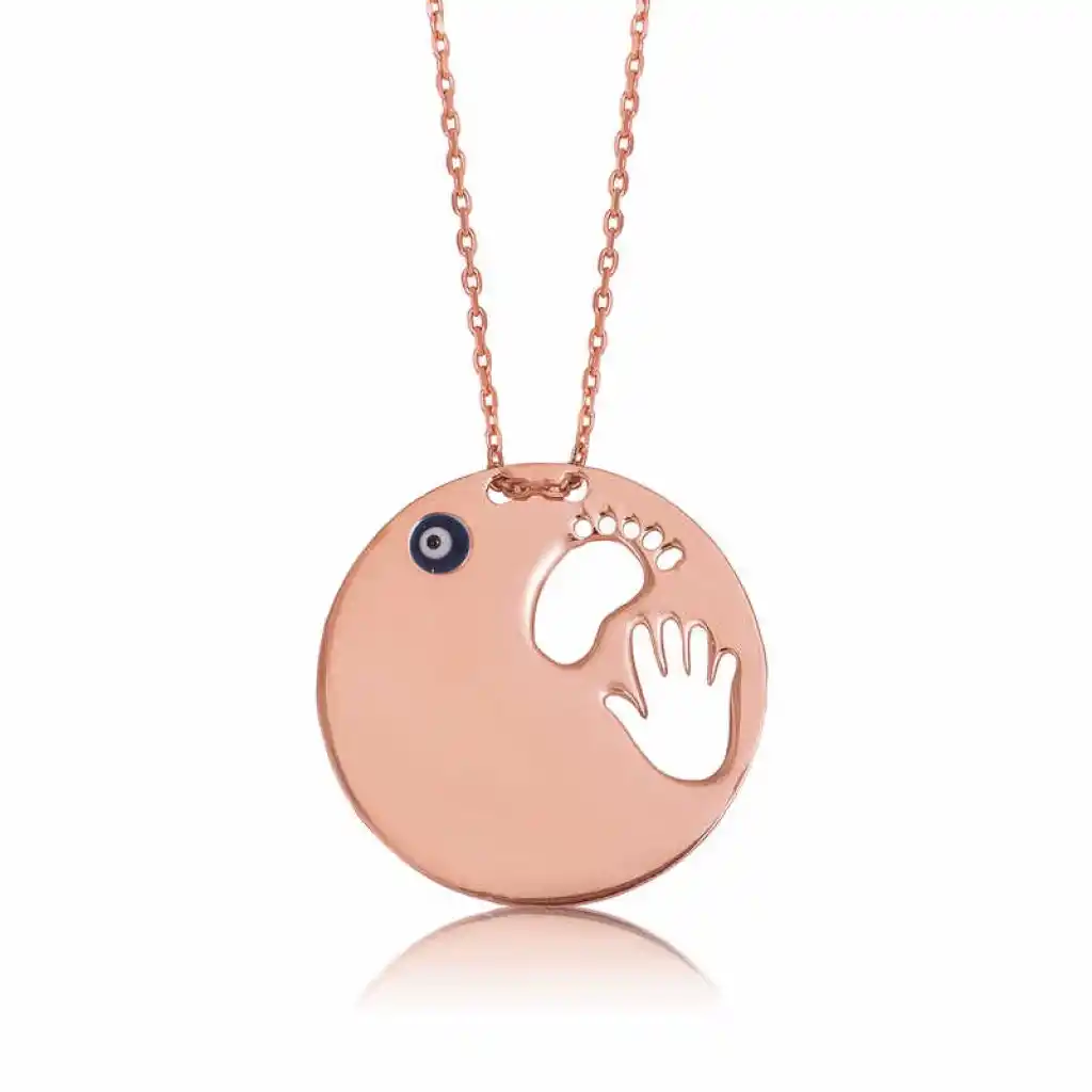 Masumiyeti ve saflığı simgeleyen el ve ayak izi kolye hayatta en değerli varlığınız olan anneniz için en anlamlı hediyelerden biri olacaktır. El ayak izi anne kolye 925 ayar gümüşten imal edilmiştir. Gümüş üzerine rose kaplama yapılmıştır. Rose kaplama yapılan gümüş bayan kolye modelleri parlaklığını uzun süre muhafaza eder. İstenildiği takdirde kolye üzerinde isim ve tarih yazılabilir. Kolye üzerindeki nazar boncuğu soğuk mine yöntemiyle yapılmıştır. Gümüş olan zincir boyu ortalama 45 cm"dir. Gümüş el ayak izi anne kolye modeli diğer tüm gümüş bayan kolye modellerinde olduğu gibi el emeği ile üretilmiştir. Gümüş ve değerli taşlar nedeniyle belirtilen ürün ağırlığında ± %10 sapma olabilmektedir.