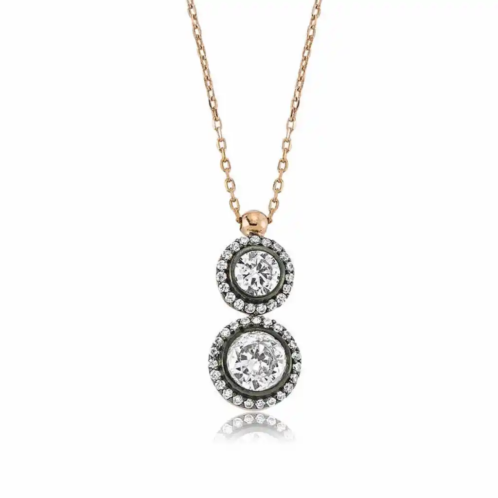 İki tane taşın birleşimiyle oluşan bu gümüş elmas model bayan kolye ile tarzınızı ortaya koyun. Sade ve şık tasarımıyla özel günlerinizde tercih edebileceğiniz bir modeldir. Elmas model bayan kolye 925 ayar gümüşten imal edilmiştir. Gümüş üzerine rose altın kaplama yapılmıştır. Rose altın kaplama yapılan gümüş bayan kolye modelleri parlaklığını uzun süre muhafaza eder ve oksitlenmesi gecikir. Kolye üzerinde bulunan taşlar zirkondur. Gümüş zincirin boyu ortalama 45 cm"dir. Tüm gümüş bayan kolye modellerinde olduğu gibi elmas model bayan kolye modeli de el emeği ile üretilmiştir. Gümüş ve değerli taşlar nedeniyle belirtilen ortalama ürün ağırlığında ± %10 sapma olabilmektedir.
