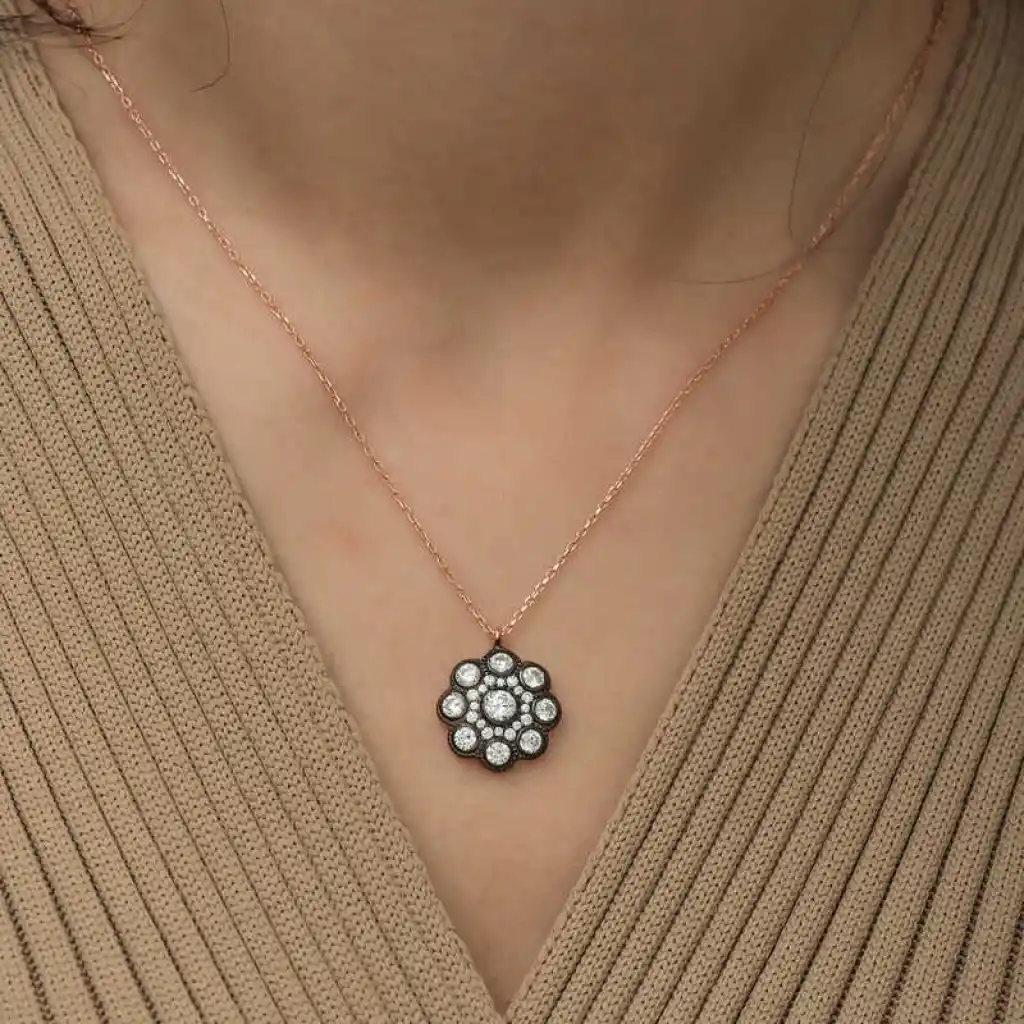 Gümüş Elmas Montür Çiçek Bayan Kolye