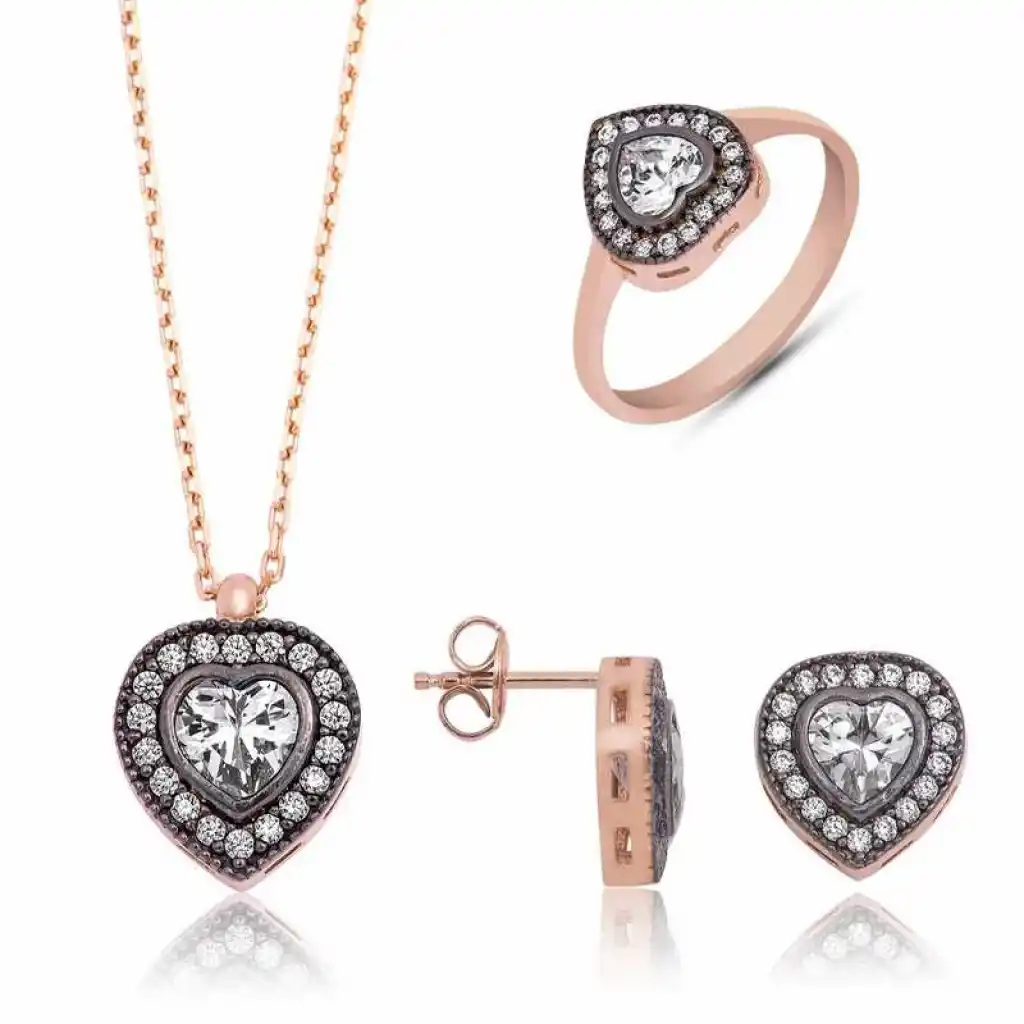 Kalp deseniyle aşkı ifade eden kalpli set modeli ile sevginiz, sevdiğiniz kadının teninde hayat bulsun. Genç sevgililerin ve kendini genç hissedenlerin özel günlerde seçebileceği bu kalpli bayan set ile sevdiğinizi aşkla süsleyin. Sizin olduğu kadar sevdiklerinizin de keyifle takacağı kalp desenli set sevdiğinize en güzel hediyelerden biri olacaktır. Kalpli bayan set 925 ayar gümüşten imal edilmiştir. Gümüş üzerine rose kaplama yapılmıştır.Rose kaplama yapılan gümüş bayan kalpli set modelleri parlaklığını uzun süre muhafaza eder, gümüşü pembe renge çevirir ve oksitlenmesi gecikir. Set üzerinde bulunan taşlar zirkondur. Gümüş olan zincir boyu ortalama 45 cm"dir. Tüm bayan setlerde olduğu gibi gümüş kalpli bayan set de el emeği ile üretilmiştir. Gümüş ve değerli taşlar nedeniyle belirtilen ortalama ürün ağırlığında ± %10 sapma olabilmektedir.