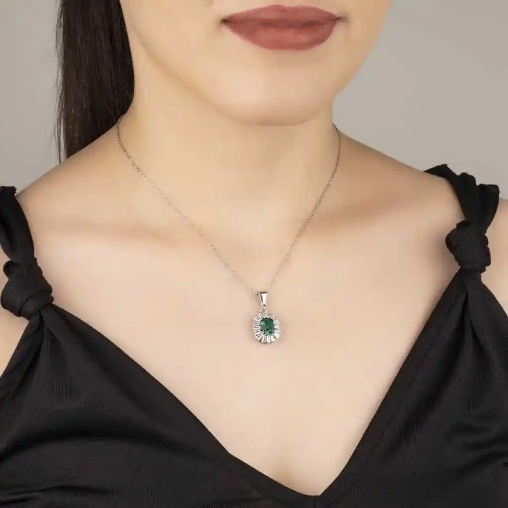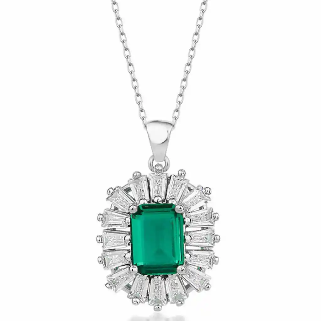 Gümüş Elmas Montür Zümrüt Taşlı Kadın Kolye