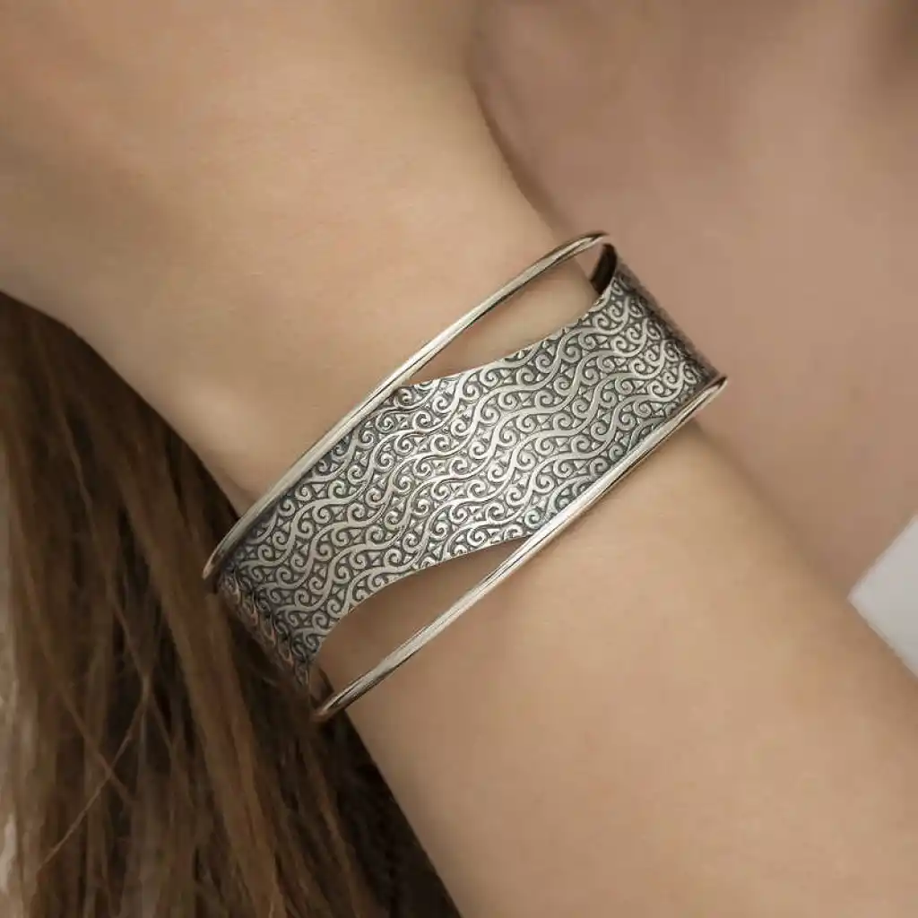 Gümüş Eskitme Desenli Bayan Bilezik