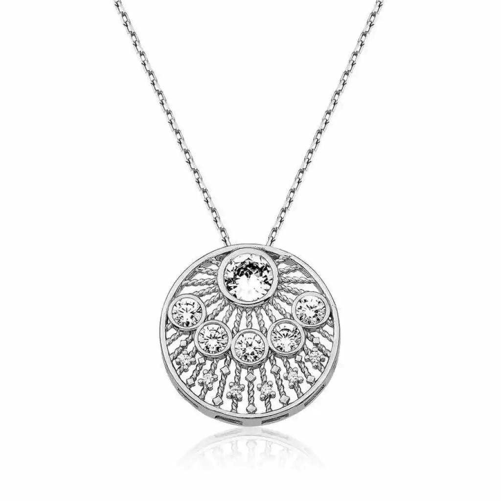 Beyaz zirkon taşlarla süslenmiş etnik desenli bayan kolye, şık ve ışıltıyı sevenler için tasarlandı. Günün her anında severek kullanabileceğiniz, herkesin beğenisini toplayabilecek ve göz kamaştırabilecek bir üründür. Gümüş etnik desenli bayan kolye 925 ayar gümüşten imal edilmiştir. Bu kolye üzerine rodyum kaplama yapılmıştır. Rodyum kaplama yapılan ürünler parlaklığını uzun süre muhafaza eder. Üzerinde bulunan taşlar zirkon"dur. Tüm gümüş bayan kolye modellerinde olduğu gibi gümüş etnik desenli bayan kolye modeli de el emeği ile üretilmiştir. Gümüş ve değerli taşlar nedeniyle belirtilen ortalama ürün ağırlığında ± %10 sapma olabilmektedir. Ürünlerimizin tamamı el emeği ile üretilmiştir.
