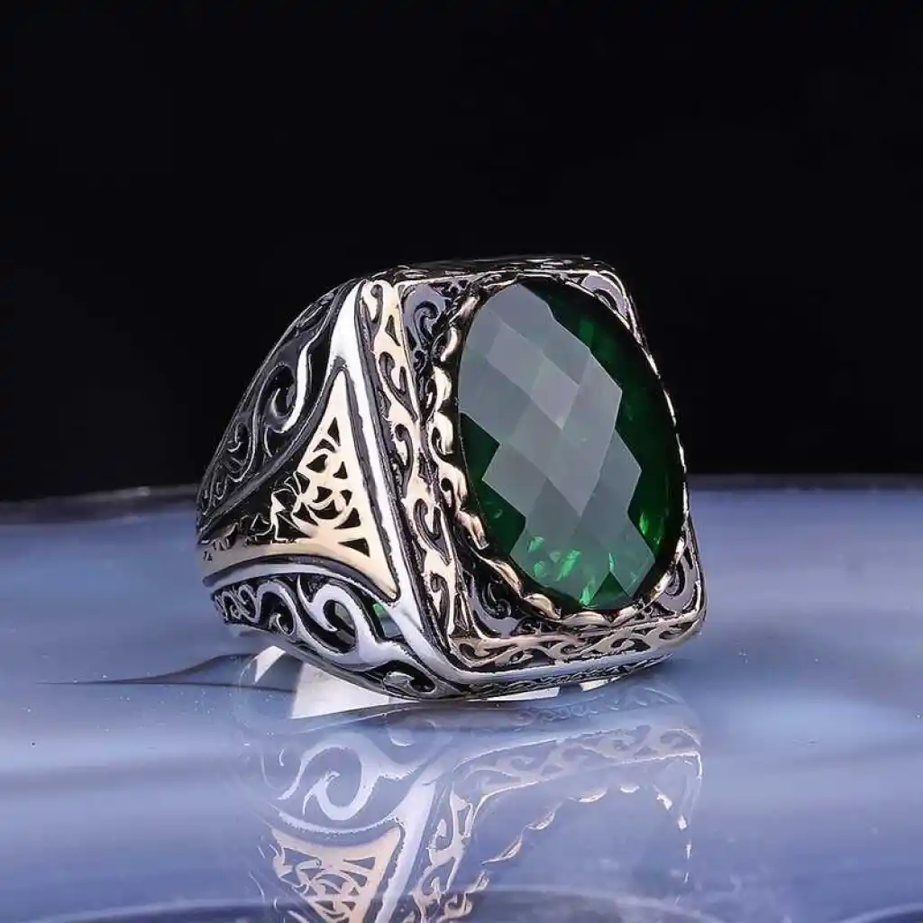 Gümüş Fasetli Yeşil Taşlı Kare Erkek Yüzük